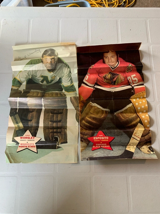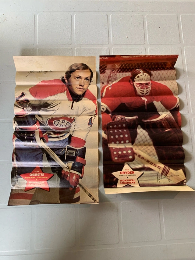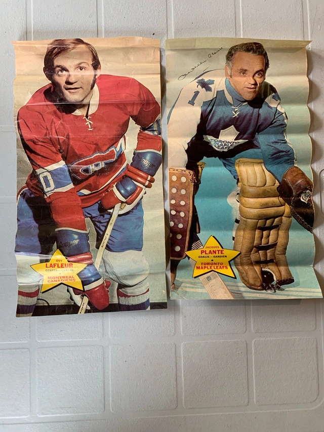 Price is for the set of 6 vintage hockey posters featuring some of the all-time greats such as Ken Dyden, Gump Worsley, Jacques Plante, Guy Lafleur, and others. These posters are in fair condition considering their age, with some visible wear. Given their vintage nature and the popularity of these players, I'm pricing these at the higher end of the collectible market. If the ad is up, they're available!