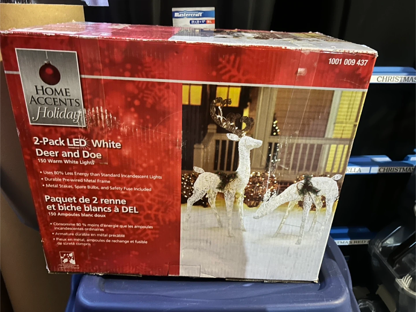 Selling a 2-pack of Home Accents Holiday white deer and doe decorations. These are 150 warm white lights. They use 80% less energy than standard incandescent lights. Includes durable pre-wired metal frame. Original price $200