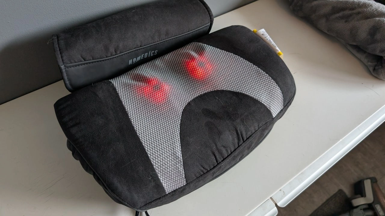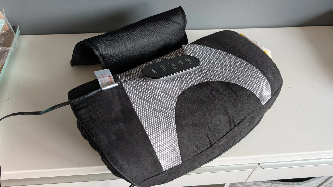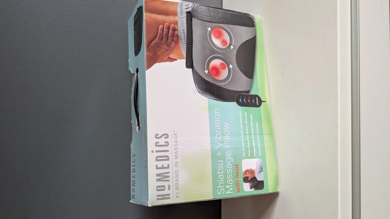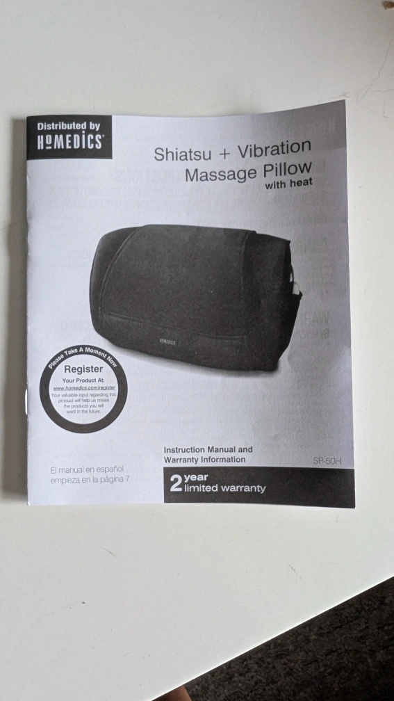 Get ready to relax with this Homedics Shiatsu + Vibration Massage Pillow with Heat! It's perfect for your neck, back, and shoulders. This pillow provides a deep kneading shiatsu massage and invigorating vibration massage with soothing heat. Comes with the box and instructions!