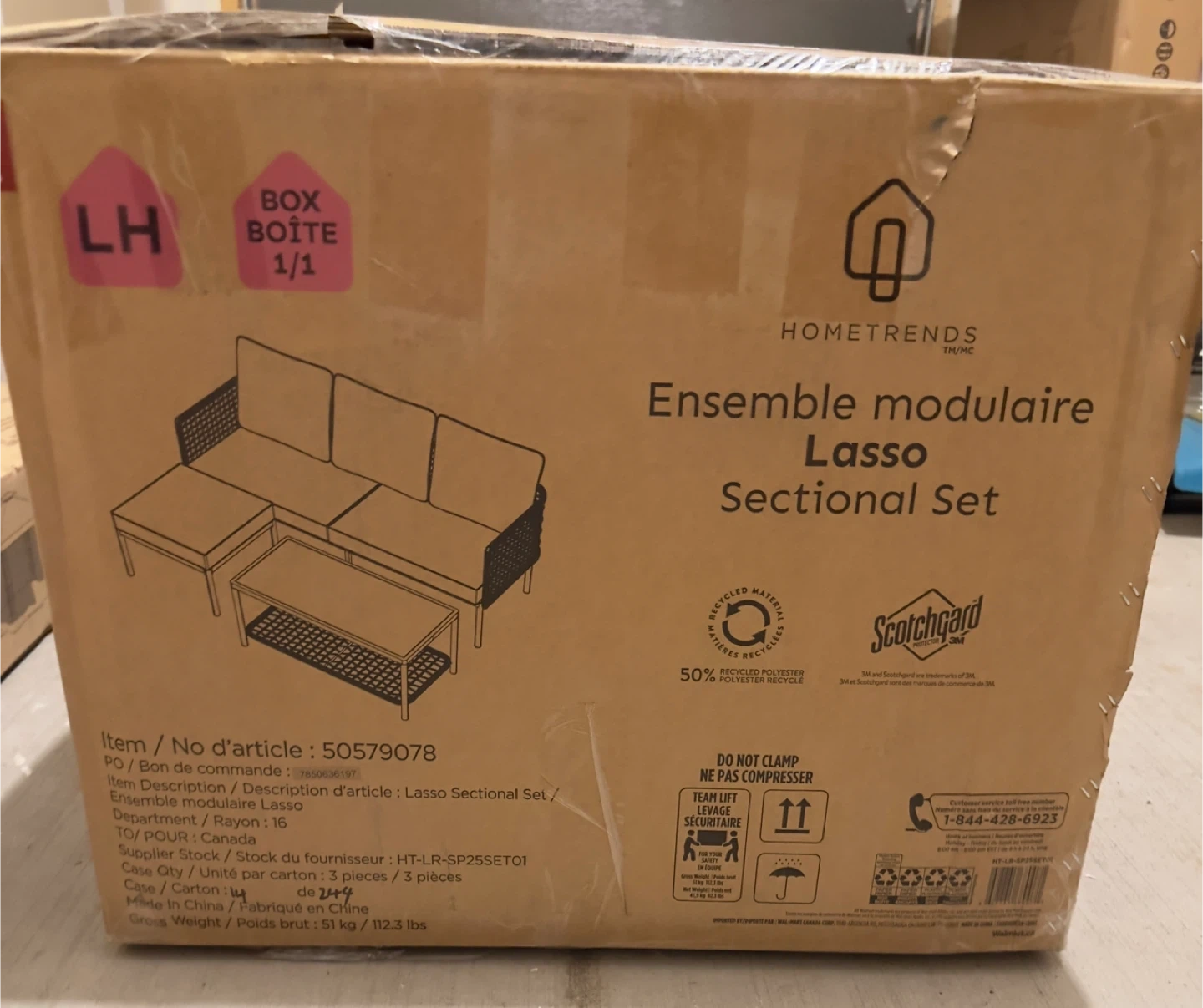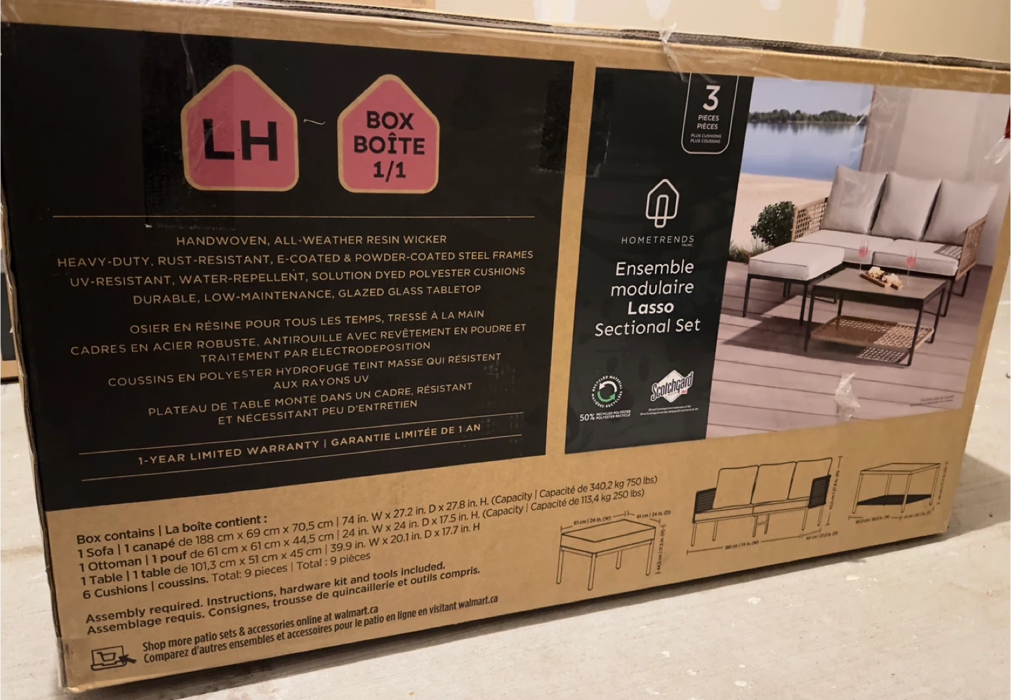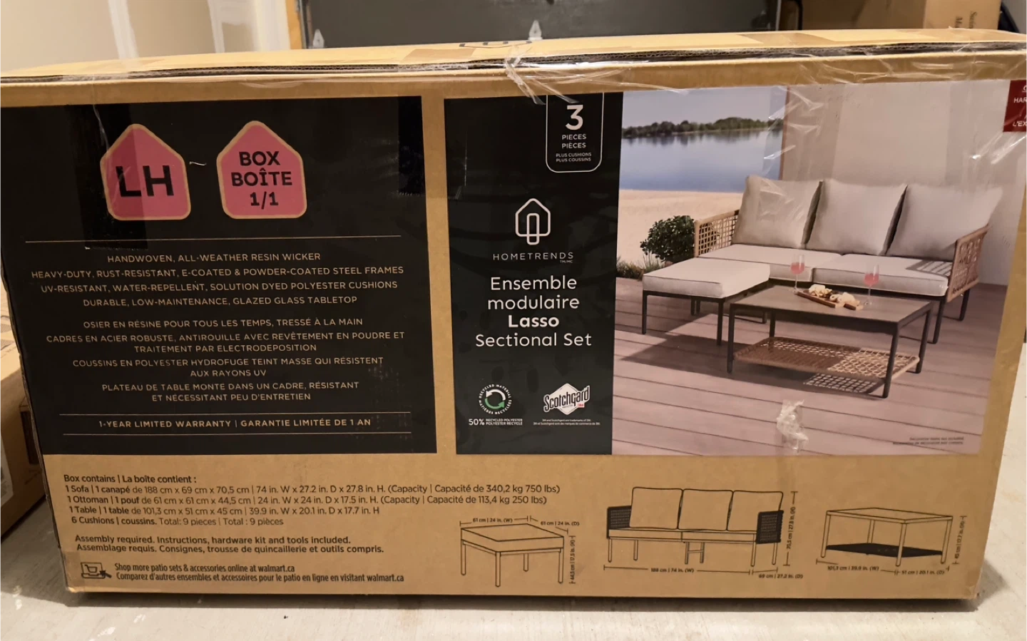 Selling a Hometrends Ensemble Modulaire Lasso Sectional Set. This set includes a sofa, ottoman, table, and cushions. It features handwoven, all-weather resin wicker, heavy-duty, rust-resistant, e-coated & powder-coated steel frames, and UV-resistant, water-repellent, solution-dyed polyester cushions. The tabletop is durable, low-maintenance, and glazed glass. Box contains all hardware and tools included for assembly