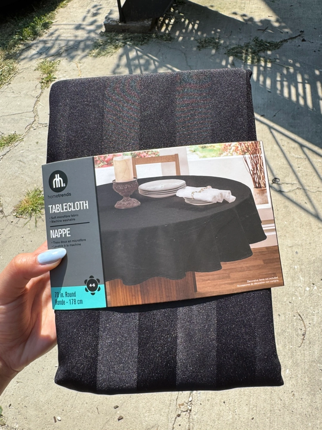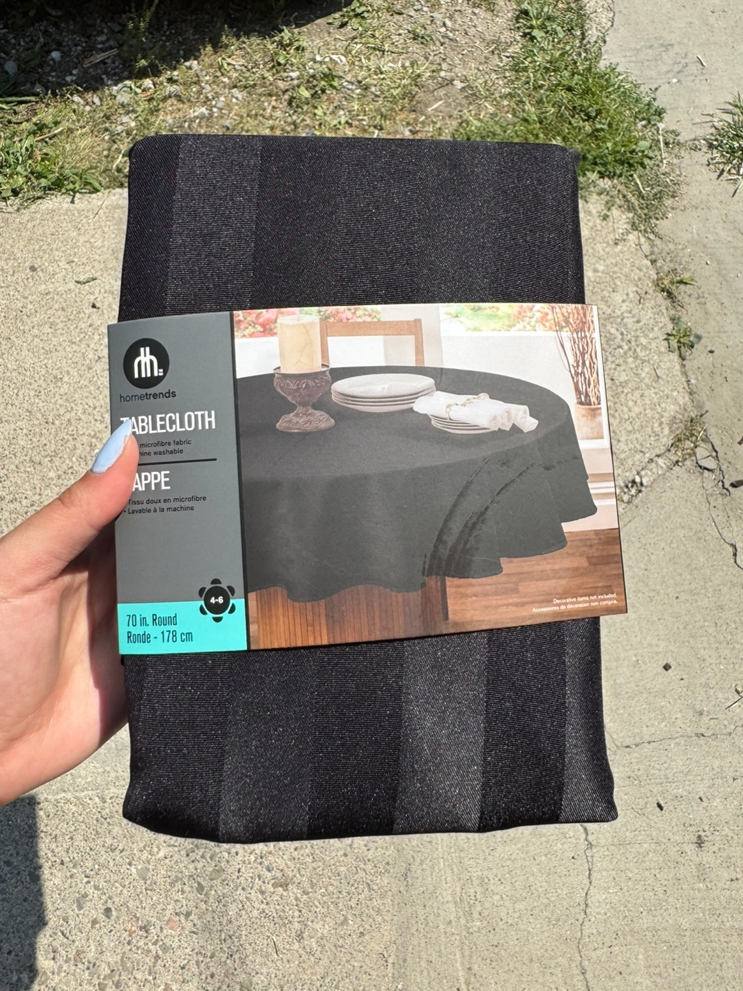 Selling a brand new hometrends tablecloth! It's a 70-inch round tablecloth in black. The material is 100% polyester and is machine washable. Fits a table for 4-6 people
