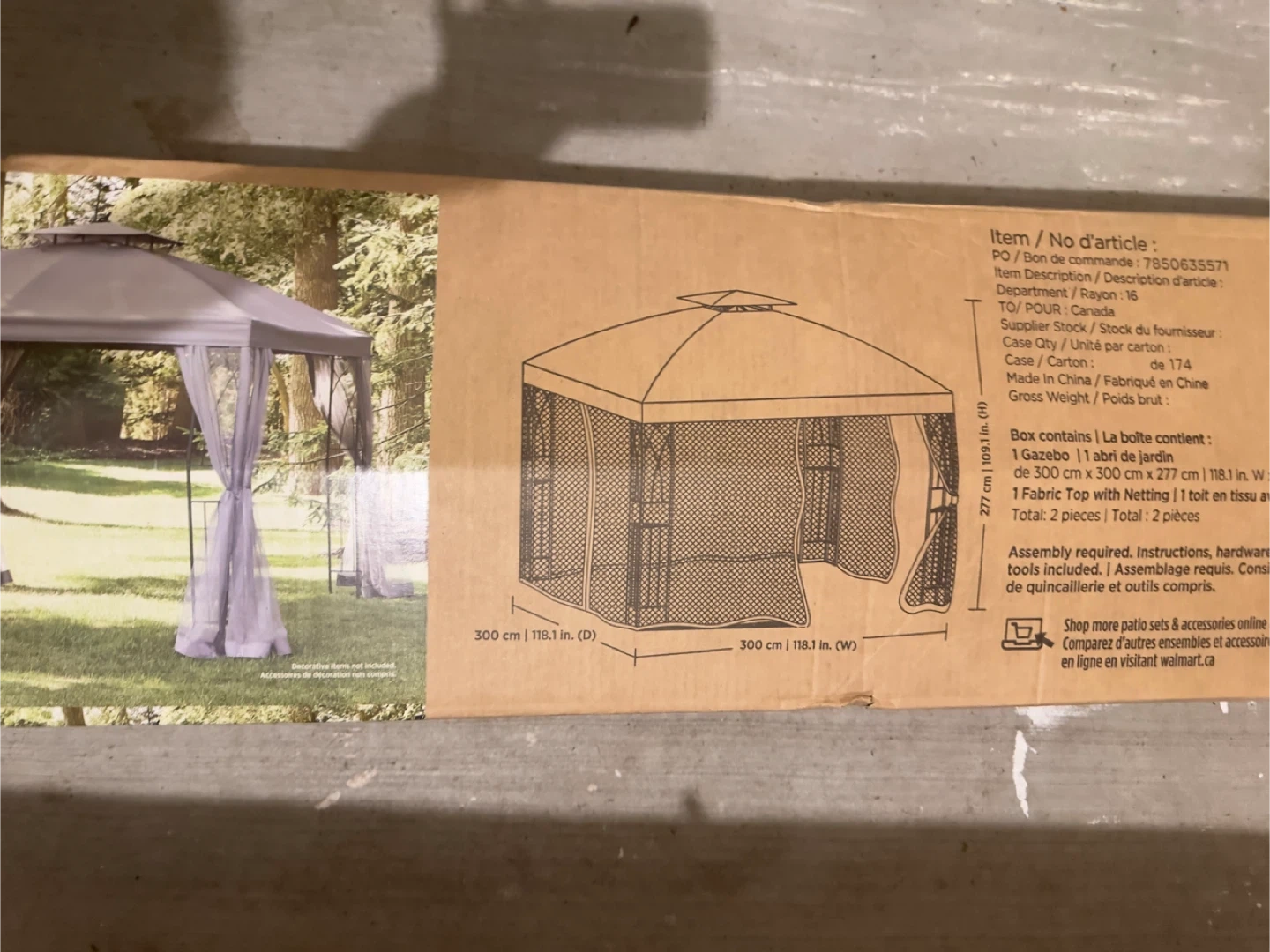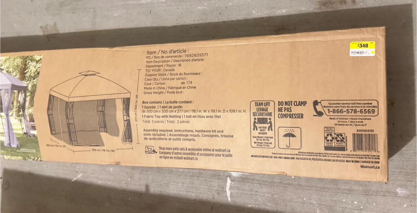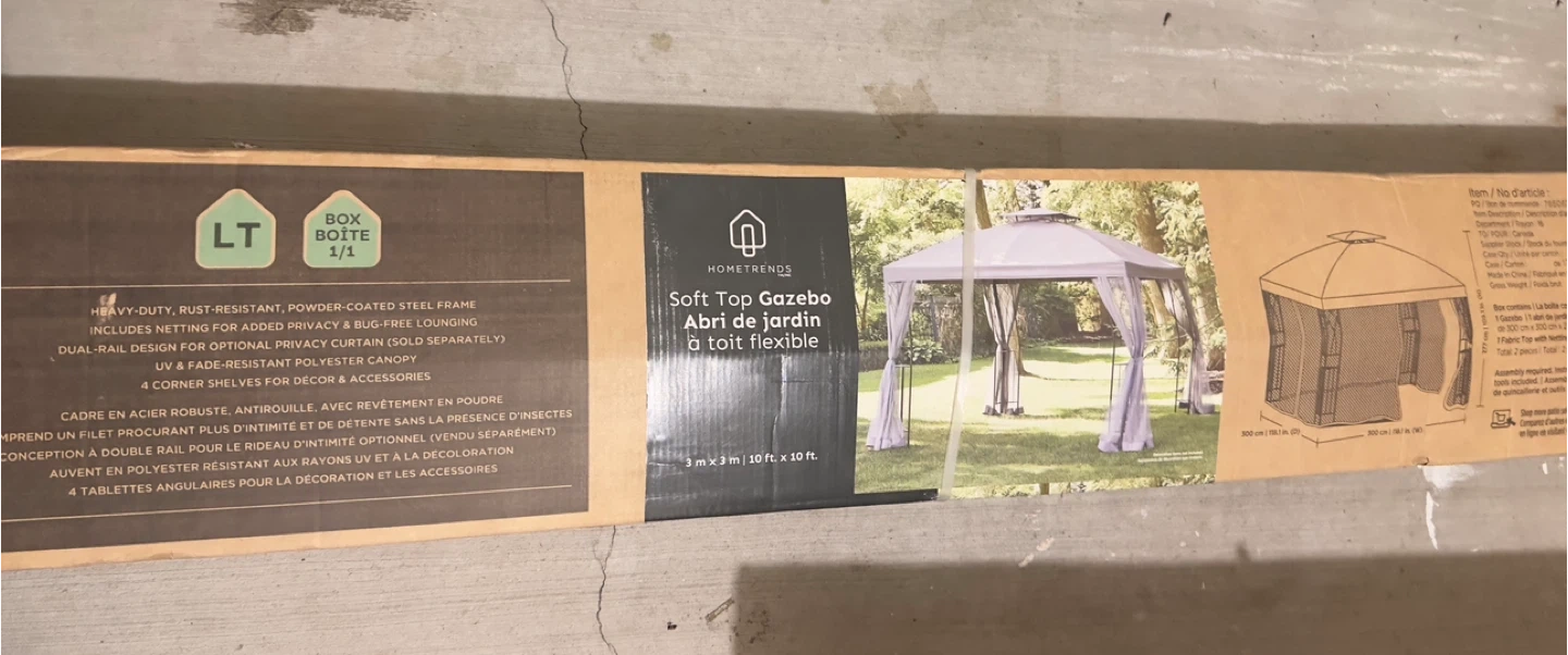 Selling a brand new Hometrends Soft Top Gazebo, still in its original box! This gazebo is perfect for adding shade and style to your backyard or patio. It measures 3m x 3m, which is about 10 ft x 10 ft. It features a heavy-duty, rust-resistant, powder-coated steel frame and UV & fade-resistant polyester canopy. It also includes netting for added privacy and bug-free lounging, as well as four corner shelves for decor or accessories. Originally bought for $348+Tax. Still in box. Bought this spring-2025, but didn’t get chance to use it due to being away from home. Asking 350$, Happy to answer any questions. Please see my other listing.