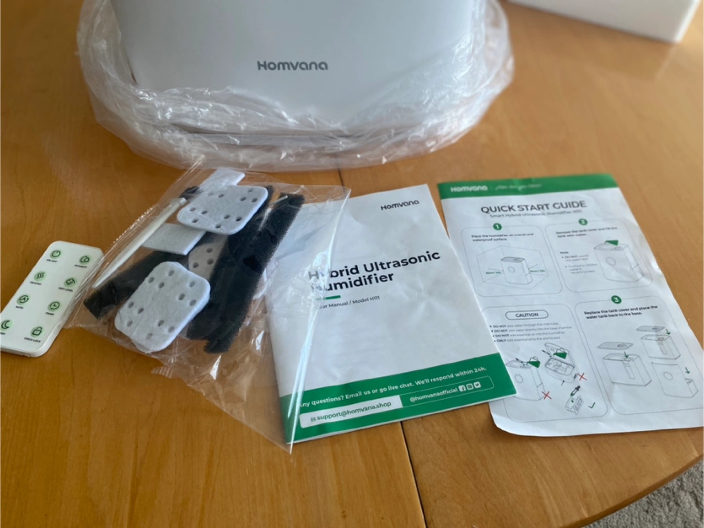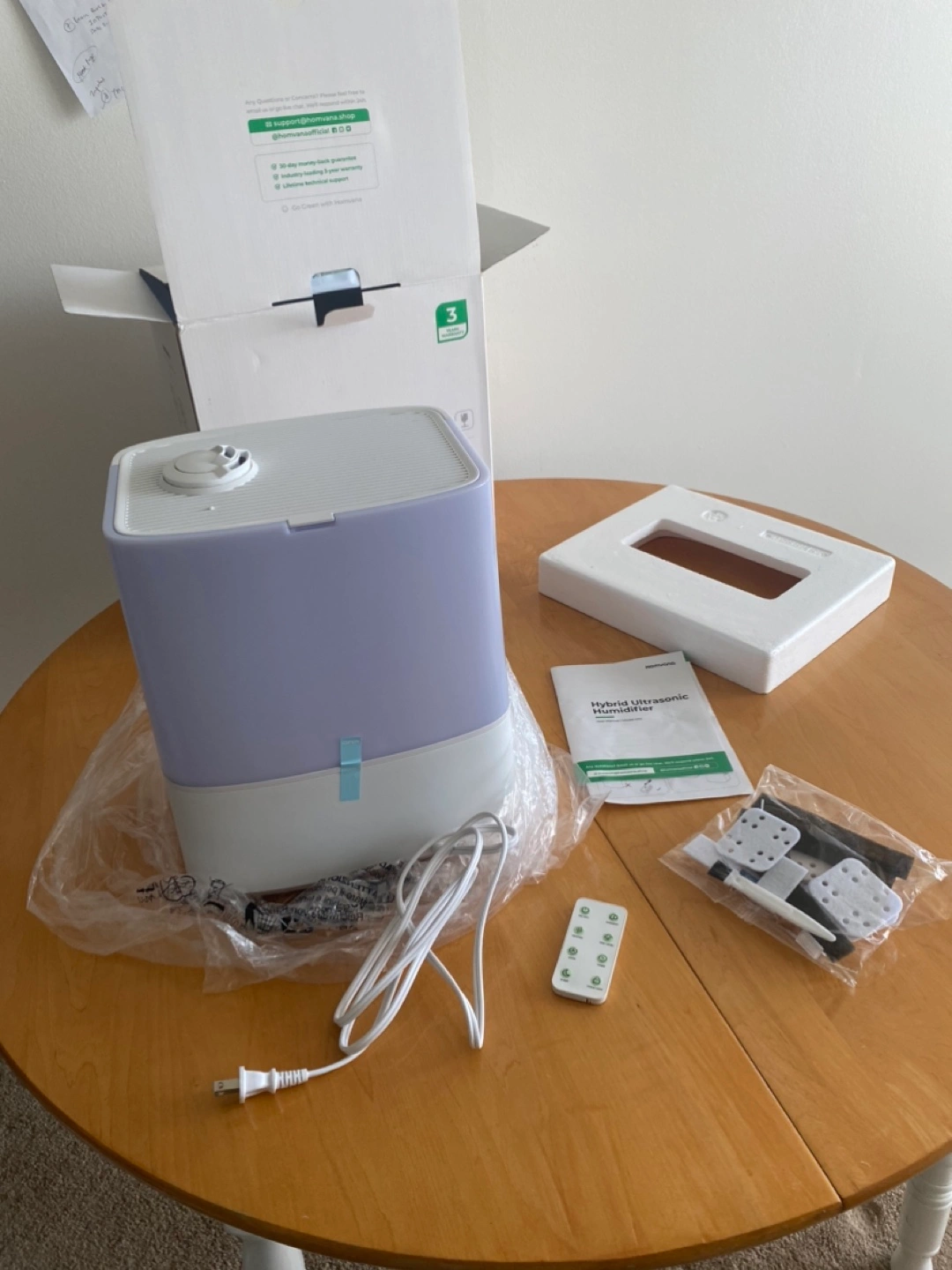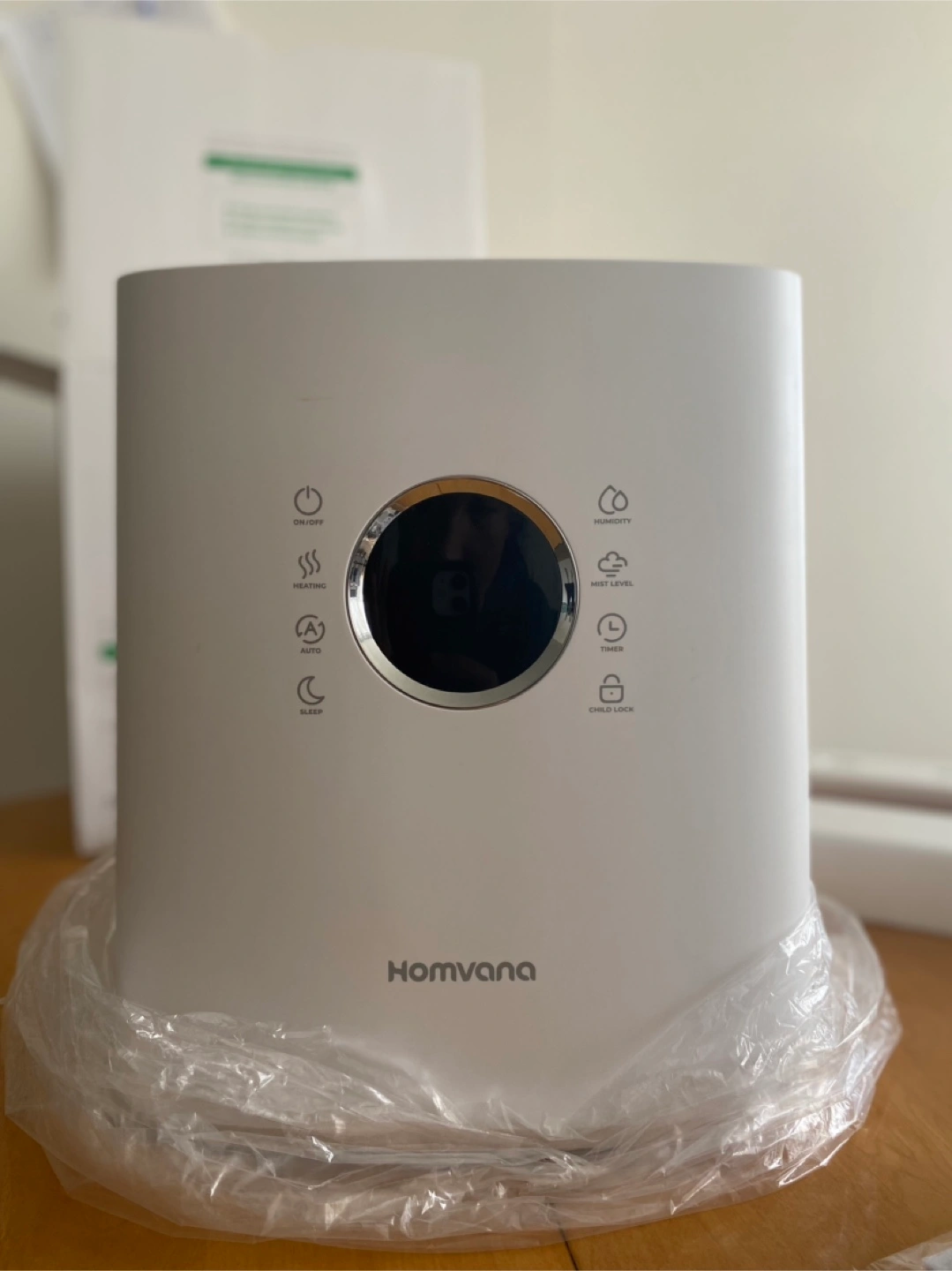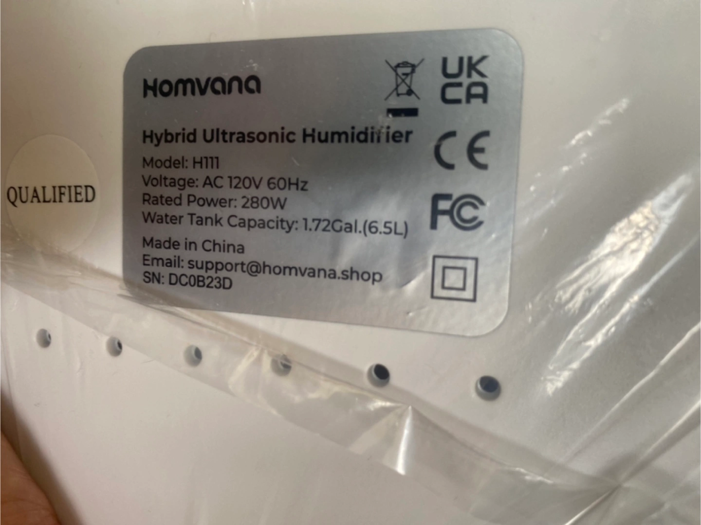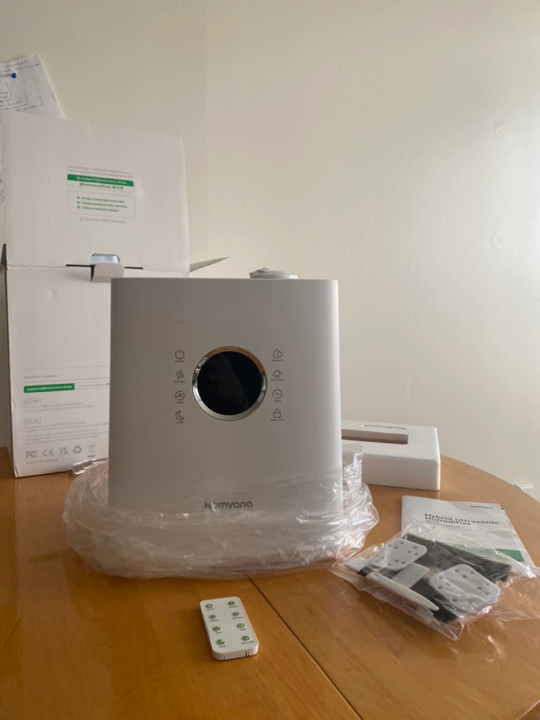 Selling a Homvana Hybrid Ultrasonic Humidifier, model H111. It comes with the box, remote, and all original accessories. The water tank capacity is 1.72 Gal (6.5L).