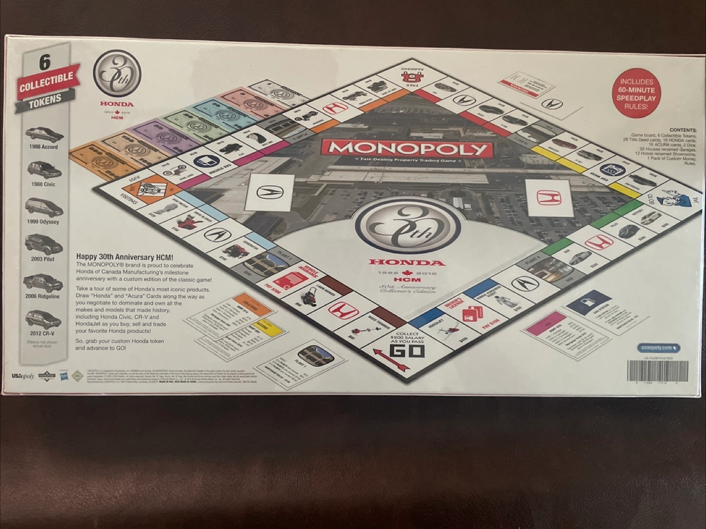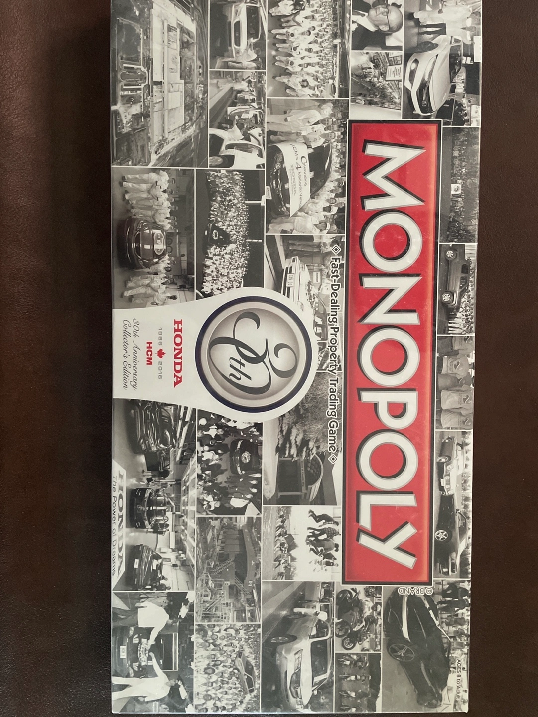 Selling a special Honda 30th Anniversary Monopoly Collector's Edition! It's a fast-dealing property trading game. The box includes 6 collectible tokens: 1986 Accord, 1988 Civic, 1999 Odyssey, 2003 Pilot, 2006 Ridgeline, and 2012 CR-V. This edition celebrates Honda's milestone anniversary with a custom edition of the classic game