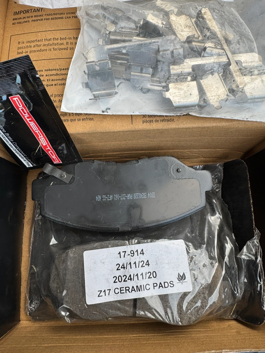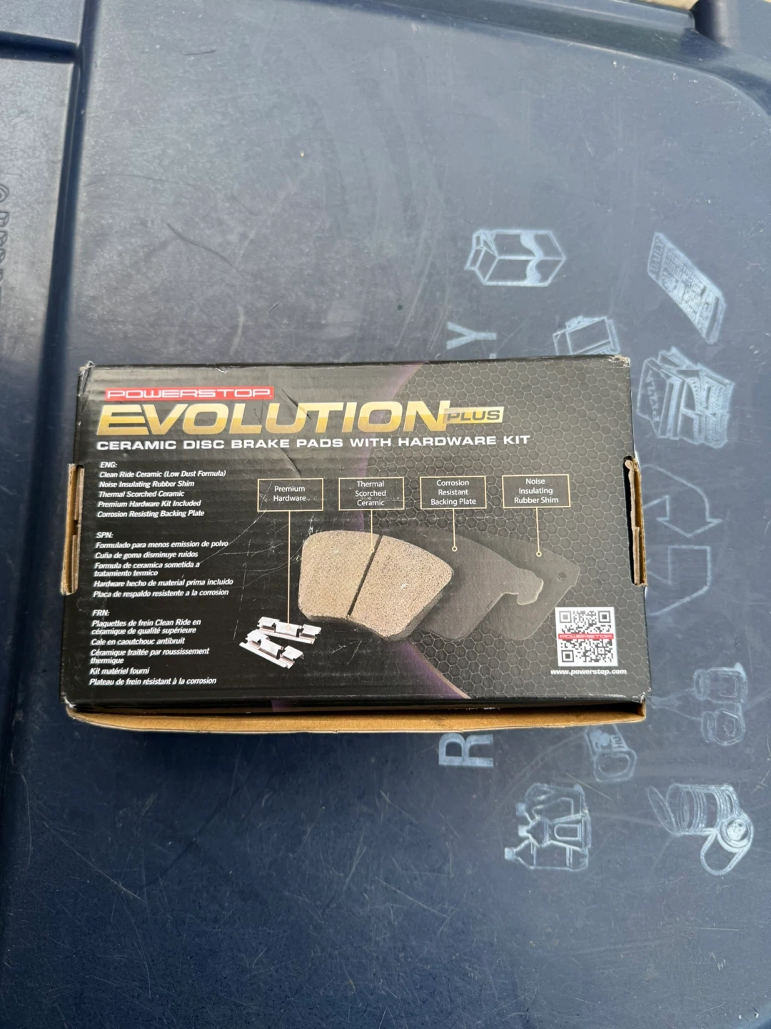 Brake pads for American spec 4 cylinder Honda Accord from 2007. Comes with hardware and a bit of grease. Brand: Power stop Part number: 17-914 These didn’t fit our Canadian spec car. Guess I bought the wrong parts. Better they get used than sit in a box forever. Ceramic w/ Hardware Features & Benefits: Low dust ceramic formula provides fade free braking performance Dual layer high temperature rubberized shims insulate noise for virtually silent braking OE positive mold technology along with a thermal scorched pad surface ensures consistent wear and performance while ensuring a fast break in Chamfered and slotted design to restore OE braking performance Includes stainless steel hardware for problem free installation I have replacement slide pins (part number 14119K) and slide pin boots/bushings (part number 16173k) that I will include.