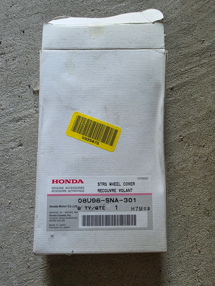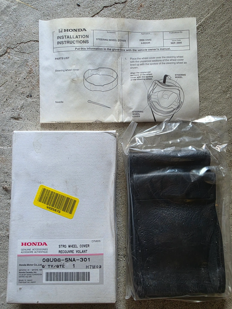 Selling a new Honda Steering Wheel Cover, part number 08U98-SNA-301. It comes in its original box with the installation instructions and all the necessary components. This is a genuine Honda accessory, so you can be sure of the quality and fit. Perfect for a 2006-2008 Civic!