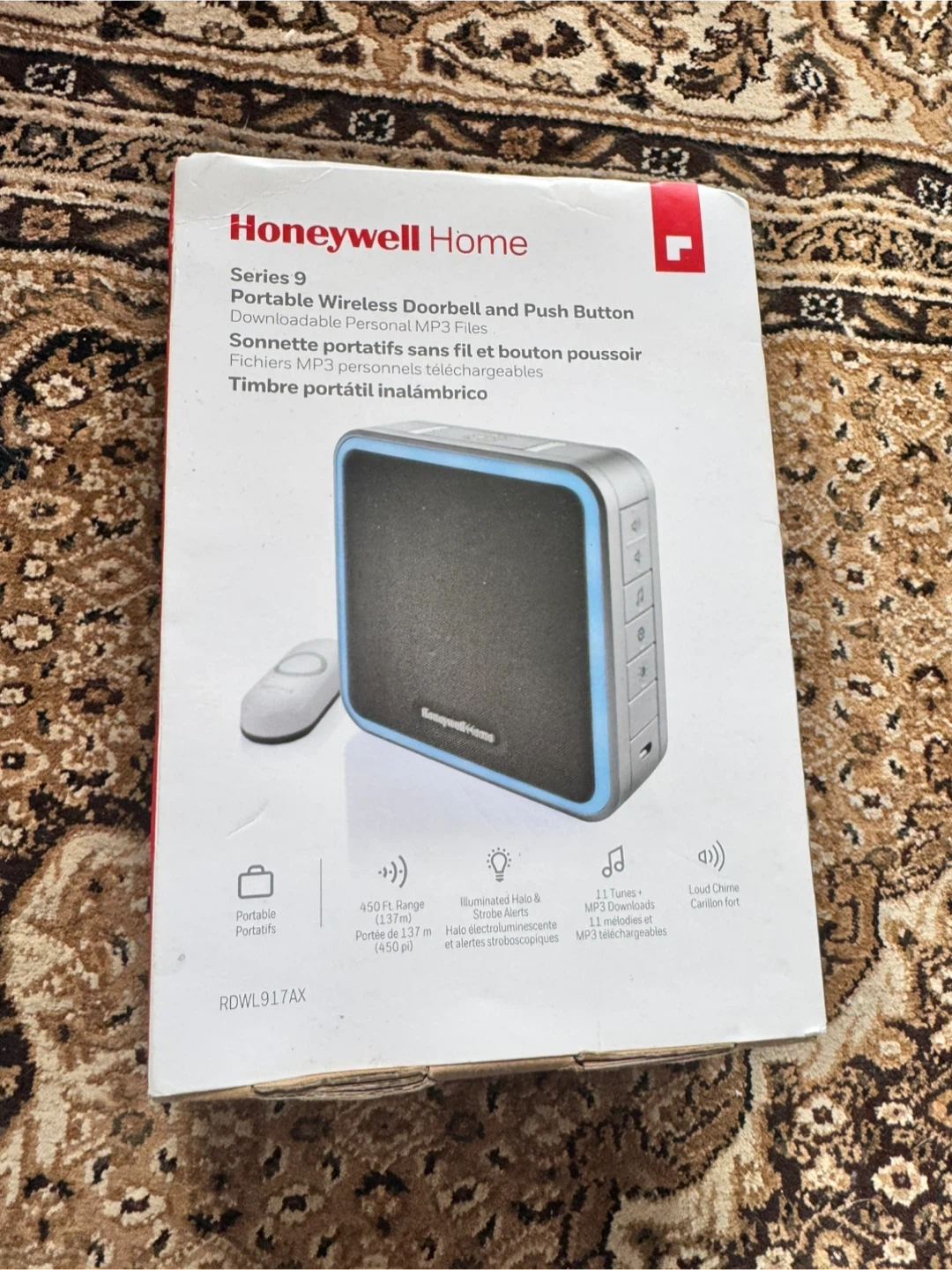 Selling a Honeywell Home Series 9 portable wireless doorbell and push button. It's in its original box and ready to go! Features include: - 450 ft range - Illuminated halo & strobe alerts - 11 tunes + MP3 downloads - Loud chime