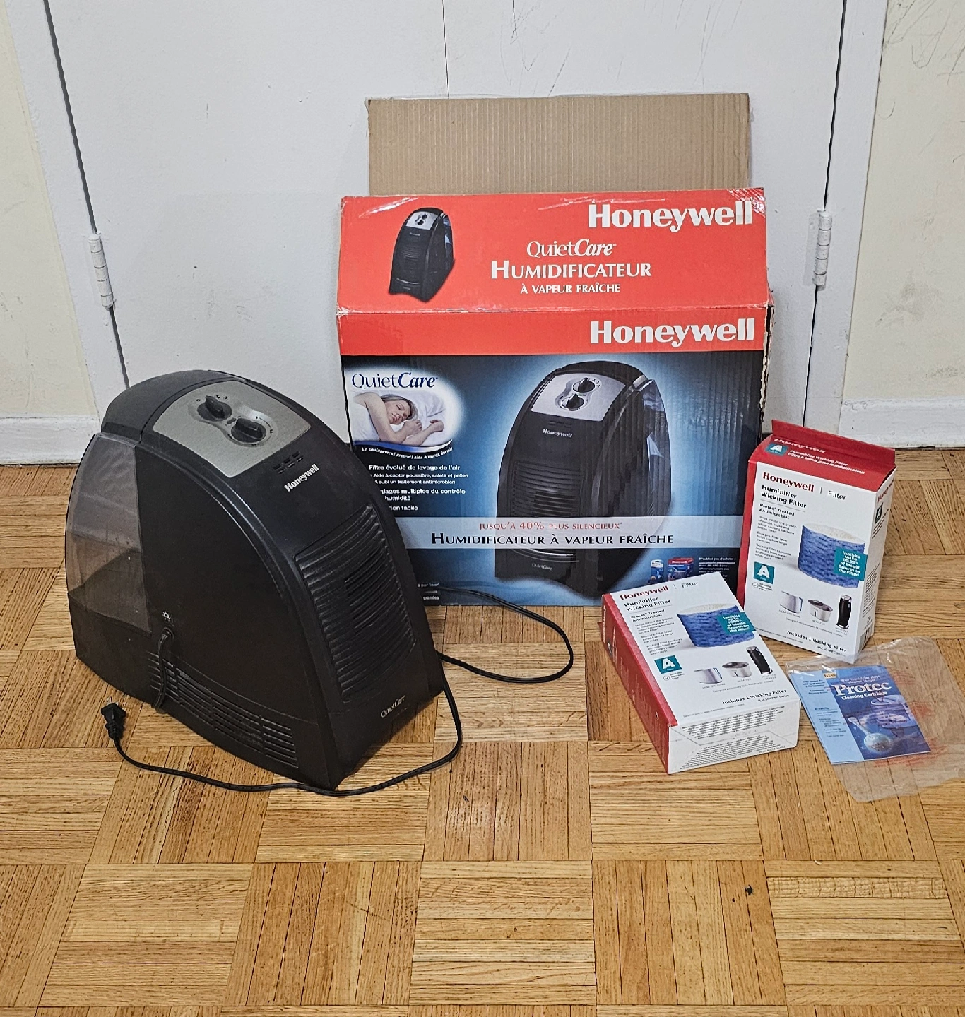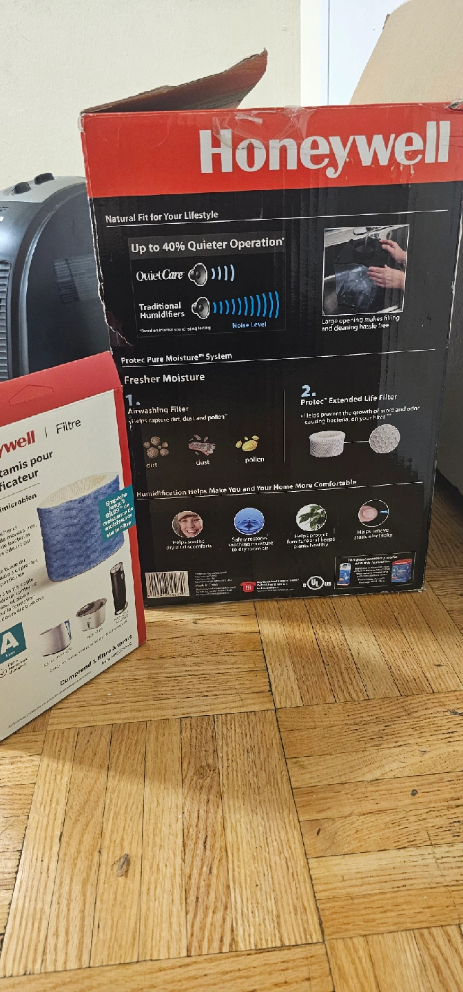 Selling a Honeywell QuietCare humidifier. It comes with the original box and two new filters. The humidifier is in good condition and ready to use! It features quiet operation and helps to create a more comfortable environment.