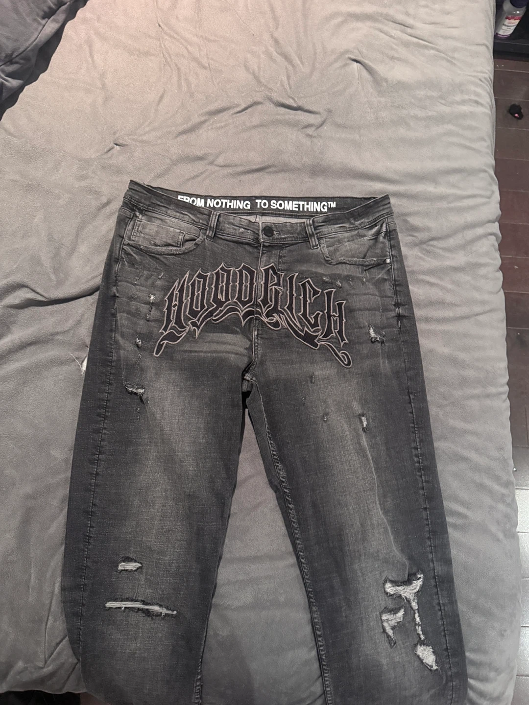 Selling a pair of Hood Rich distressed black jeans. They have a unique design and are in good condition. The jeans feature a 'FROM NOTHING TO SOMETHING' detail on the waistband and stylish distressing throughout