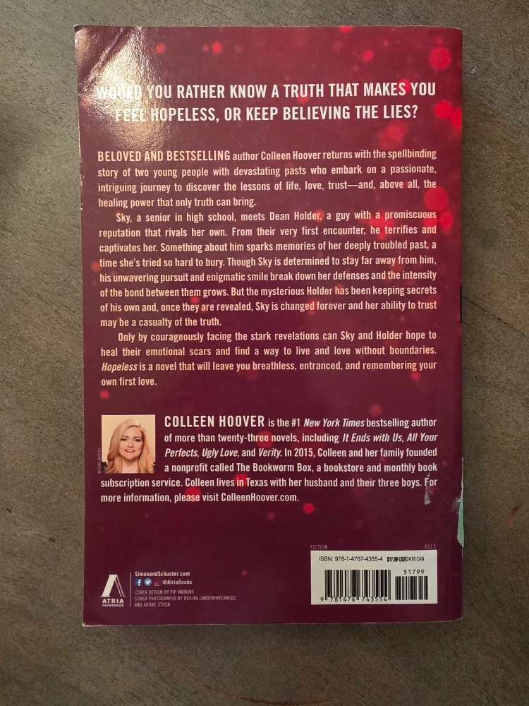 Selling the novel Hopeless by Colleen Hoover! It's a beloved and bestselling story about love, trust, and healing. Follow Sky and Dean's journey as secrets unravel and they face stark revelations. Great read!