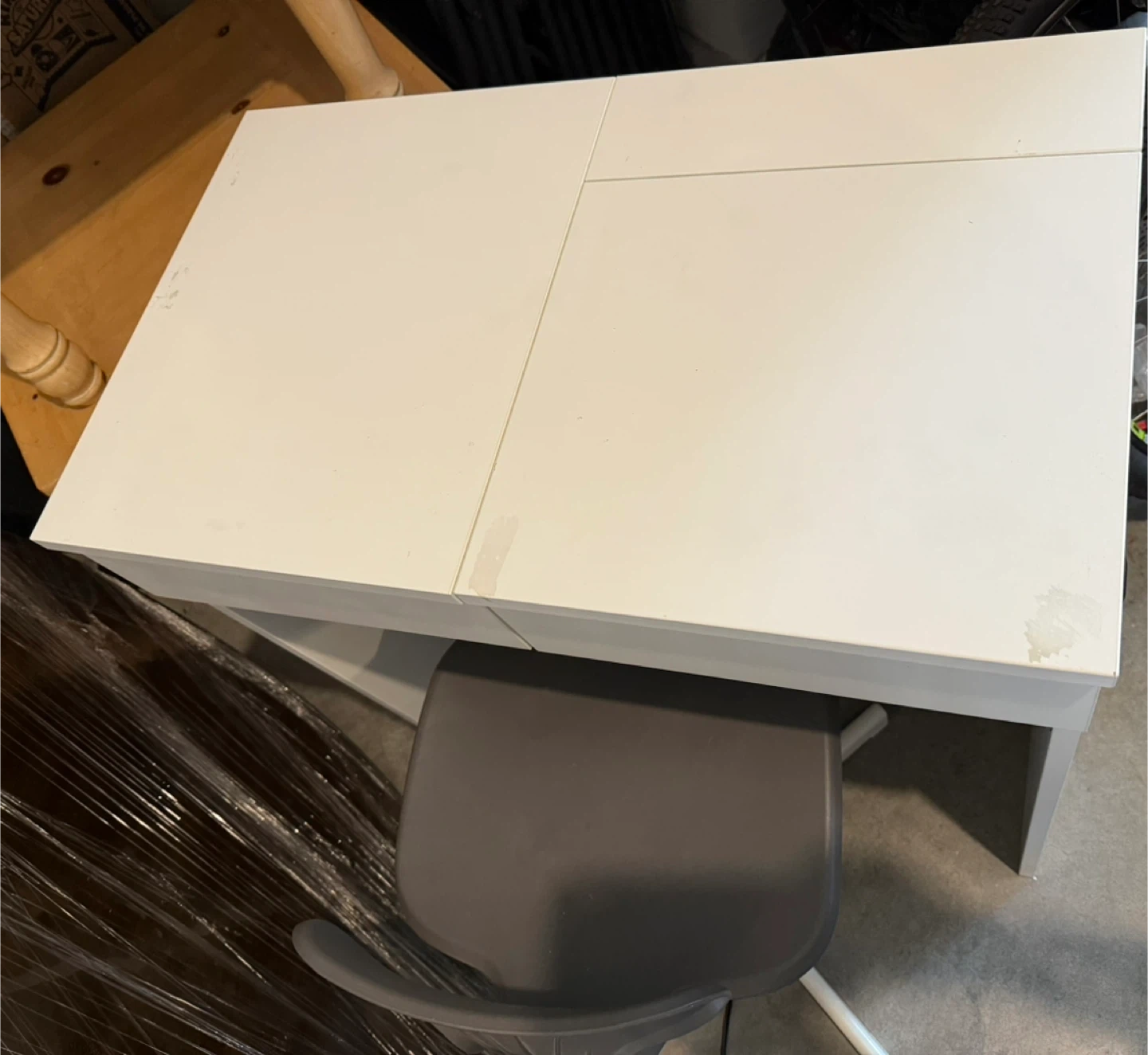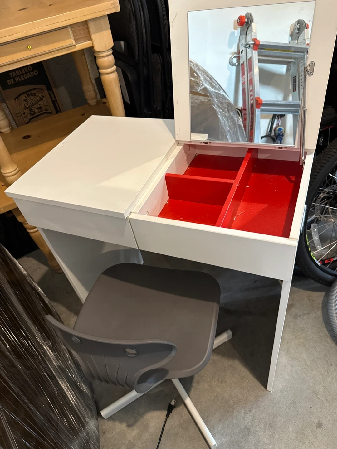 Looking to sell this vanity desk! It's white with a mirror and includes a chair. It's in good condition and perfect for a bedroom or dressing area. Let me know if you're interested!