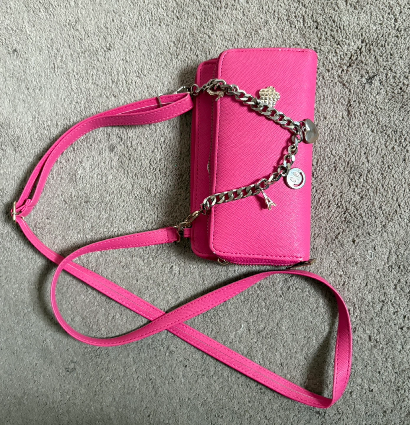 Check out this vibrant hot pink crossbody wallet bag! It features a stylish chain and is perfect for carrying your essentials while keeping your hands free! It's in great condition and ready for a new home