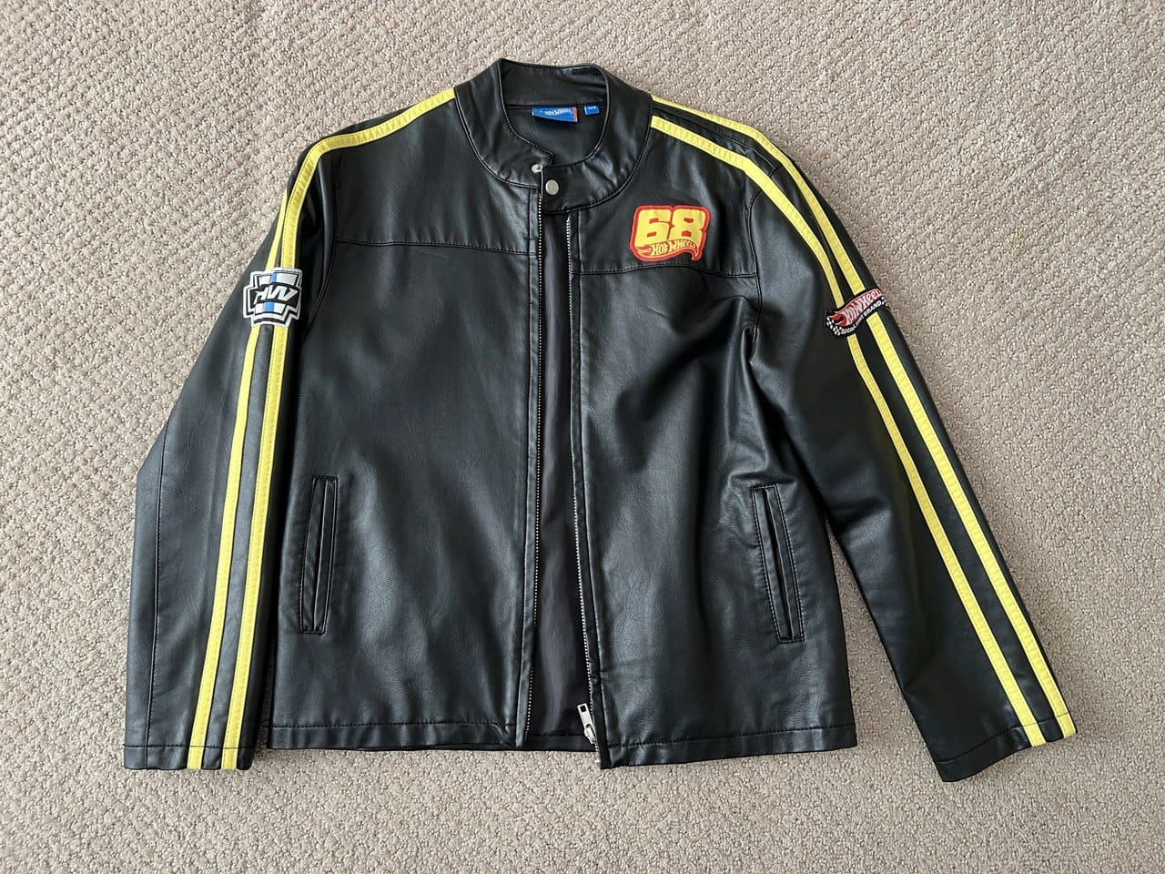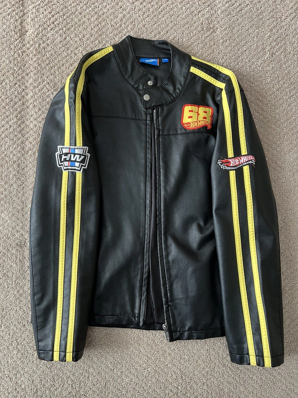Black faux leather jacket with yellow racing stripes and Hot Wheels patches. Open to offers!