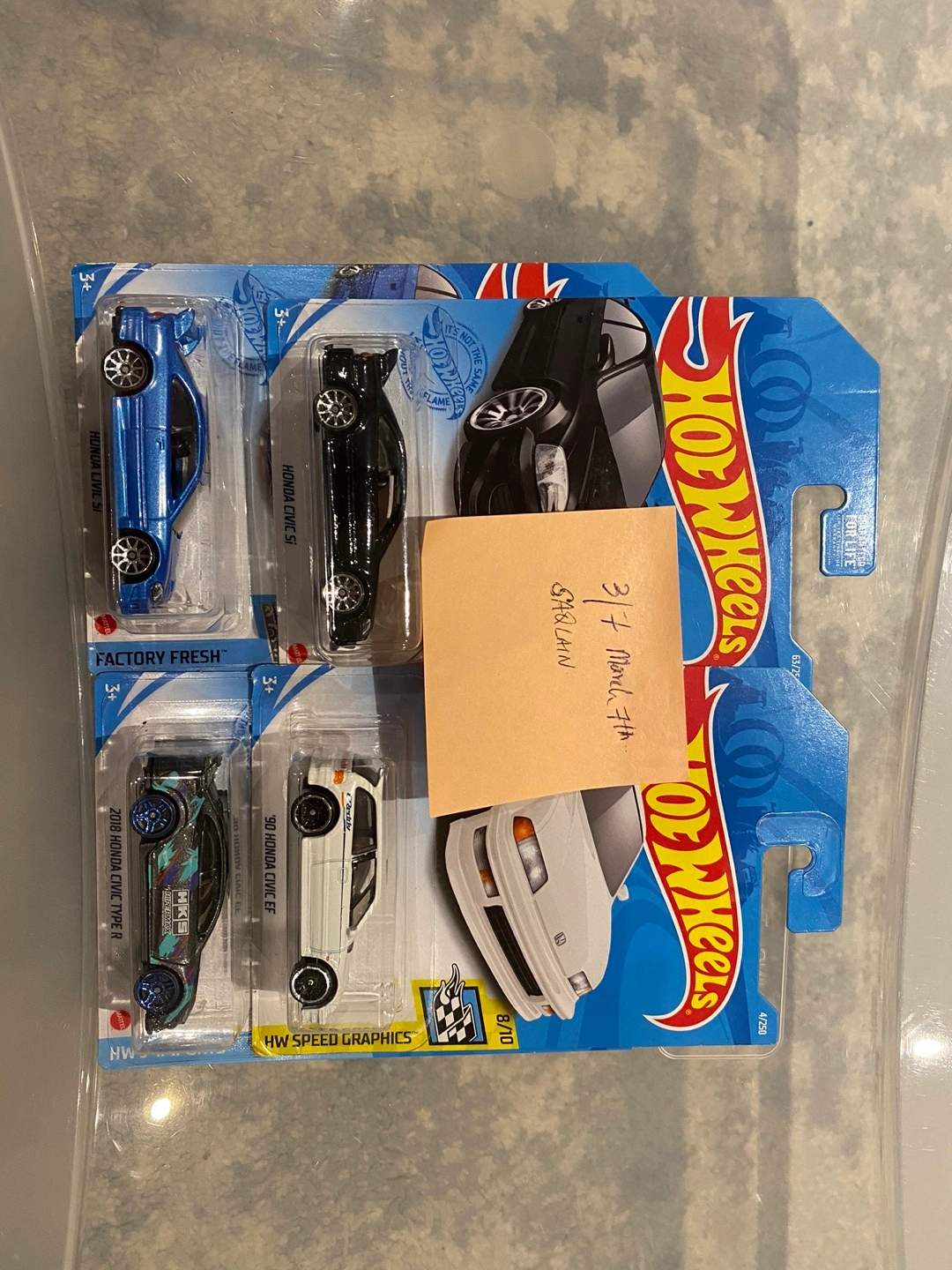 Five Hot Wheels Honda Civics. Factory fresh. Includes various models and colours. Collectible cars. 50$ for all