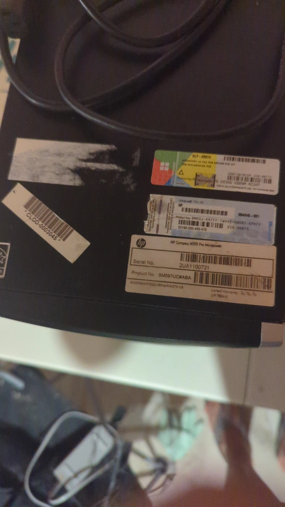 Selling a used HP Compaq 6005 Pro Microtower. It comes with the power cable and VGA cable. It has some signs of use.