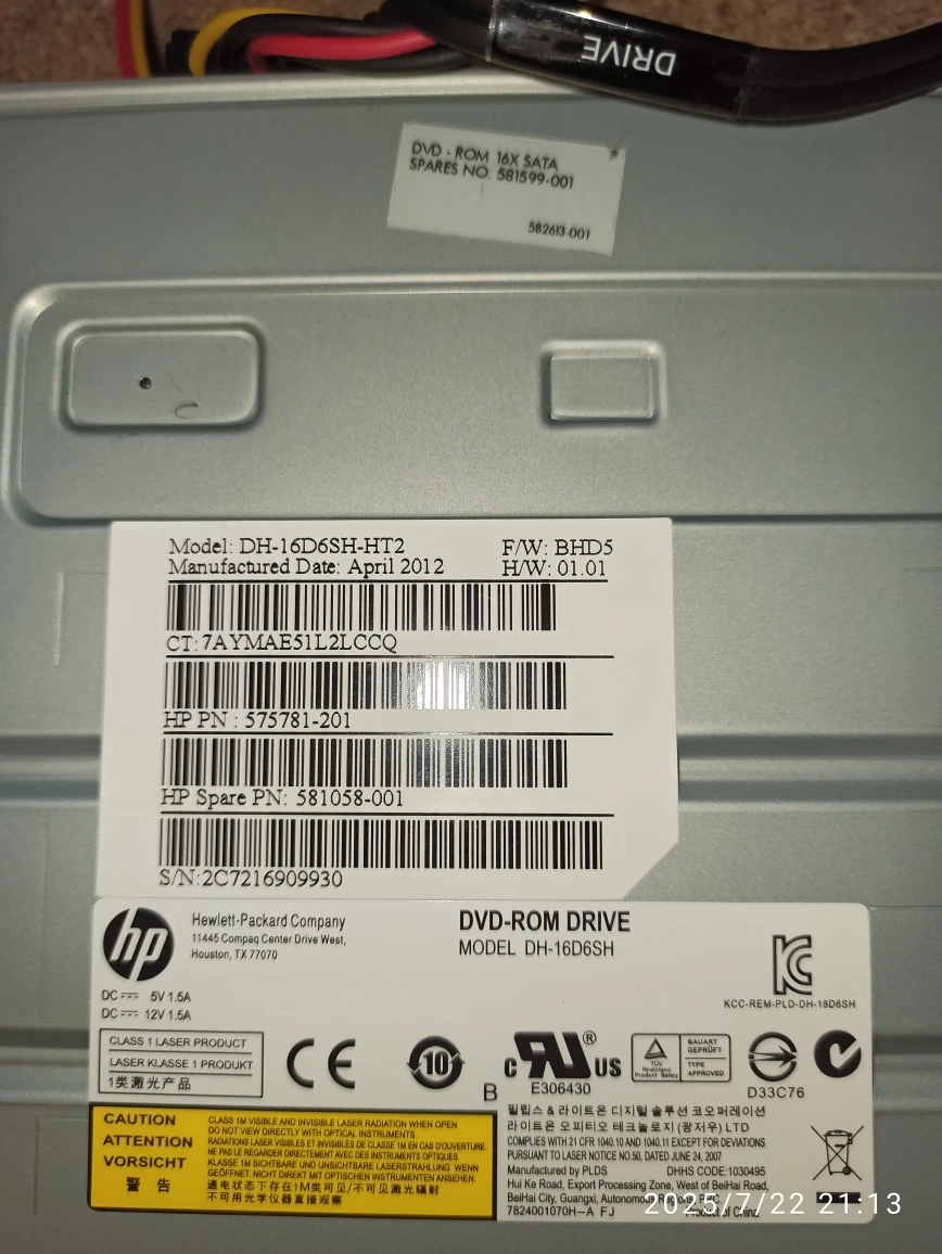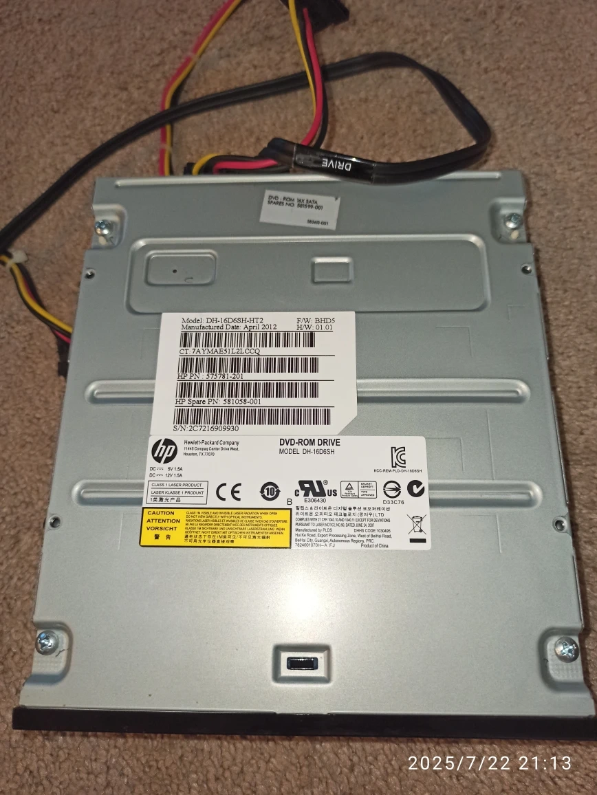 Selling a HP DVD-ROM drive, model DH-16D6SH. It's in good working condition and ready to be installed in your computer. The manufacturing date is April 2012.