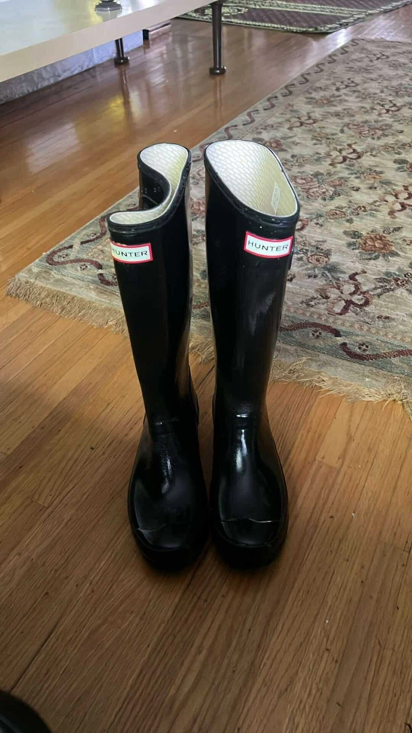 Selling a pair of Hunter Huntress Gloss rain boots in black! They are a US size 8 and in great condition. Perfect for rainy days!