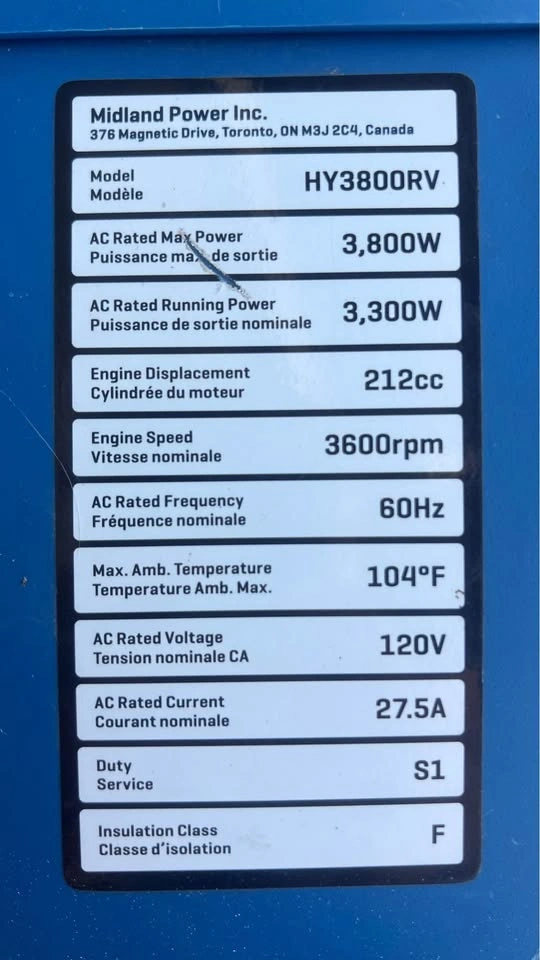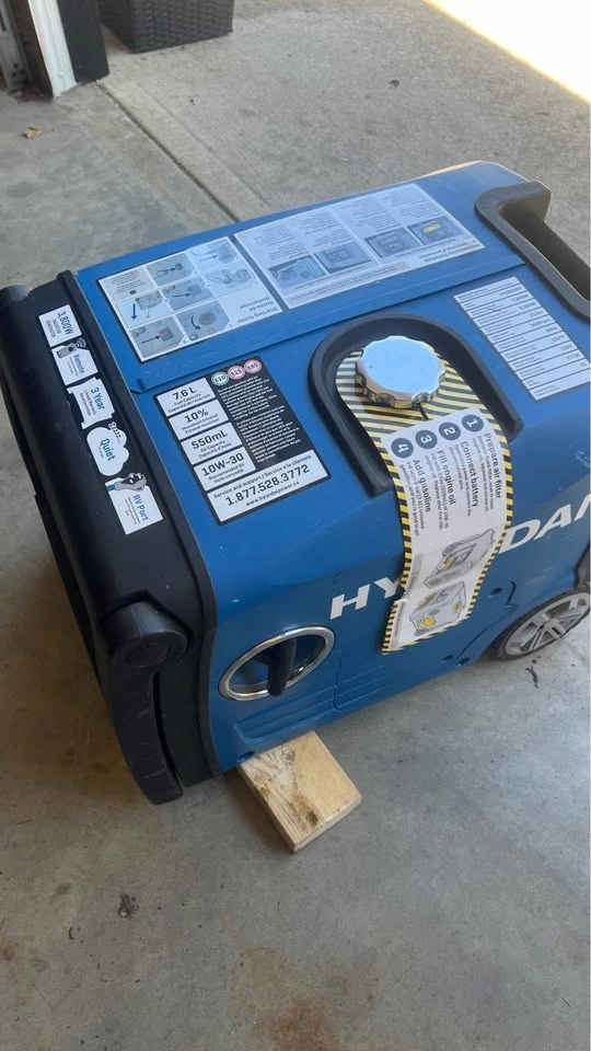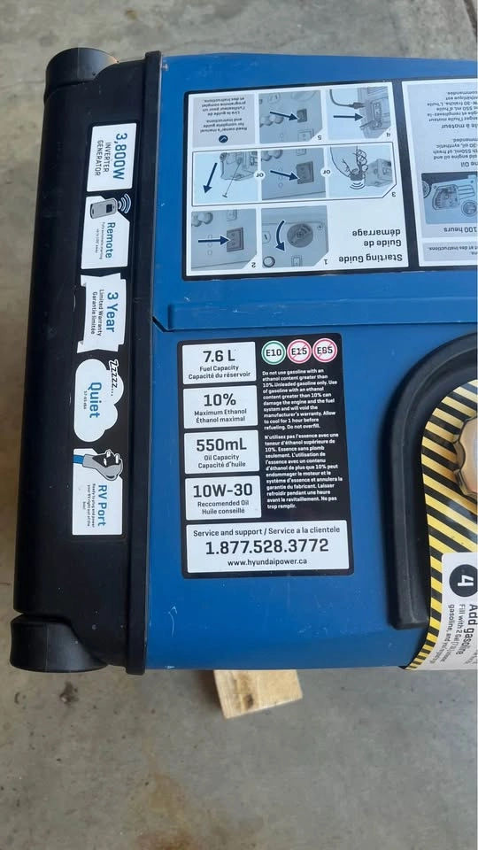New Hyundai HY3800RV Generator with only 15 hours on it. Paid $1500 a couple years back and has been sitting in the garage since. Feel free to ask me any questions, down below is all the information about it. Specs Peak Watts 3,800 Running Watts 3,300 Amps (120V) 27.5A Start Method Recoil Start, Electric Start, Remote Start Power Delivery Pure Sine EcoMode Parallel Capability No Motor 212cc Noise Level (25%) 57dB(A) Noise Level (100%) 65dB(A) Fuel Capacity 7.4L Runtime (25%) 14.0 hrs Runtime (100%) 3.4 hrs Panel Outlets 5-20 20A x 2, TT-30 30A RV, 12V DC, 5A USB Outlet x 2 Choke Fully Automatic Dimensions 23.2 x 16.5 x 17.7 in. Unit Weight 96 lbs Warranty 3 Year Limited Extended Warranty 12, 24 & 36 Months Available Additional Features TT-30 RV Plug, USB Ports The Hyundai HY3800RV was built to simplify RV life. Premium convenience features such as an integrated RV receptacle, remote and electric start, automatic throttle, automatic choke are included to make powering your RV as effortless as pressing a button. Producing a continuous 3,300 watts of clean electricity, the HY3800RV quietly powers sensitive electronics like TV’s Laptops, CPAP machines, microwaves, A/C units, etc. The integrated RV receptacle outputs 120V at 27.5A, perfect for powering appliances such as 13K BTU A/C units and most 15K BTU A/C. An innovative single-outlet parallel port (with cross model support) makes connecting two HY-P series generators easy, allowing you to combine the power of two generators into a single output. Operating at 57 – 65db this unit is campground approved and perfect for RV owners that want effortless power. Backed by a 3-year warranty, 700 service centres across North America, and an experienced customer service team.