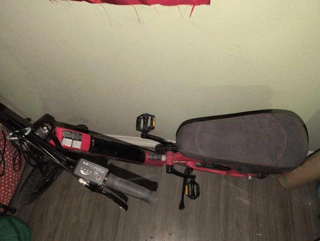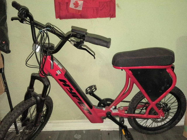 I'm selling my used Hyper E-Ride electric bike, which is great for short commutes and recreational rides. The bike features a robust frame and a comfortable seat. It also includes a functional battery compartment. This bike has been used, so it shows signs of wear, but still works perfectly. Here are some details: * Brand: Hyper * Model: E-Ride * Type: Electric Bike * Condition: Used * Colour: Red and Black Note: key to the battery is lost. If the ad is up, the bike is available! No need to ask!