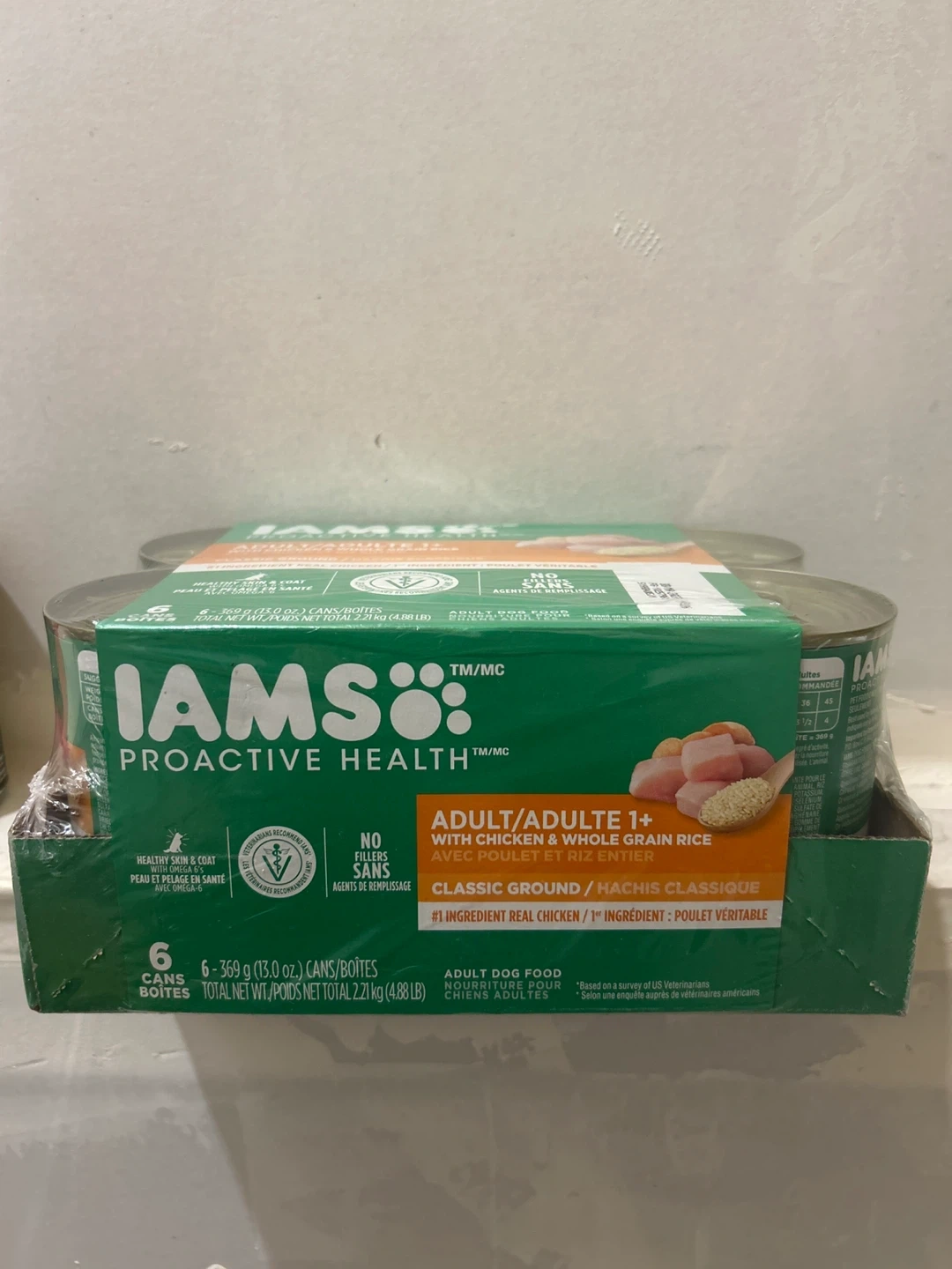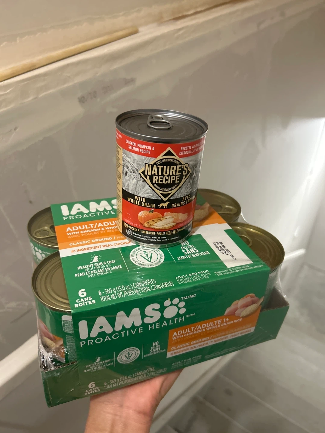 I have a pack of Iams Proactive Health Adult dog food cans for sale! These are the Classic Ground recipe with chicken and whole grain rice. There are 6 cans in the pack. Also including a Nature's Recipe can of chicken, pumpkin, and salmon recipe!