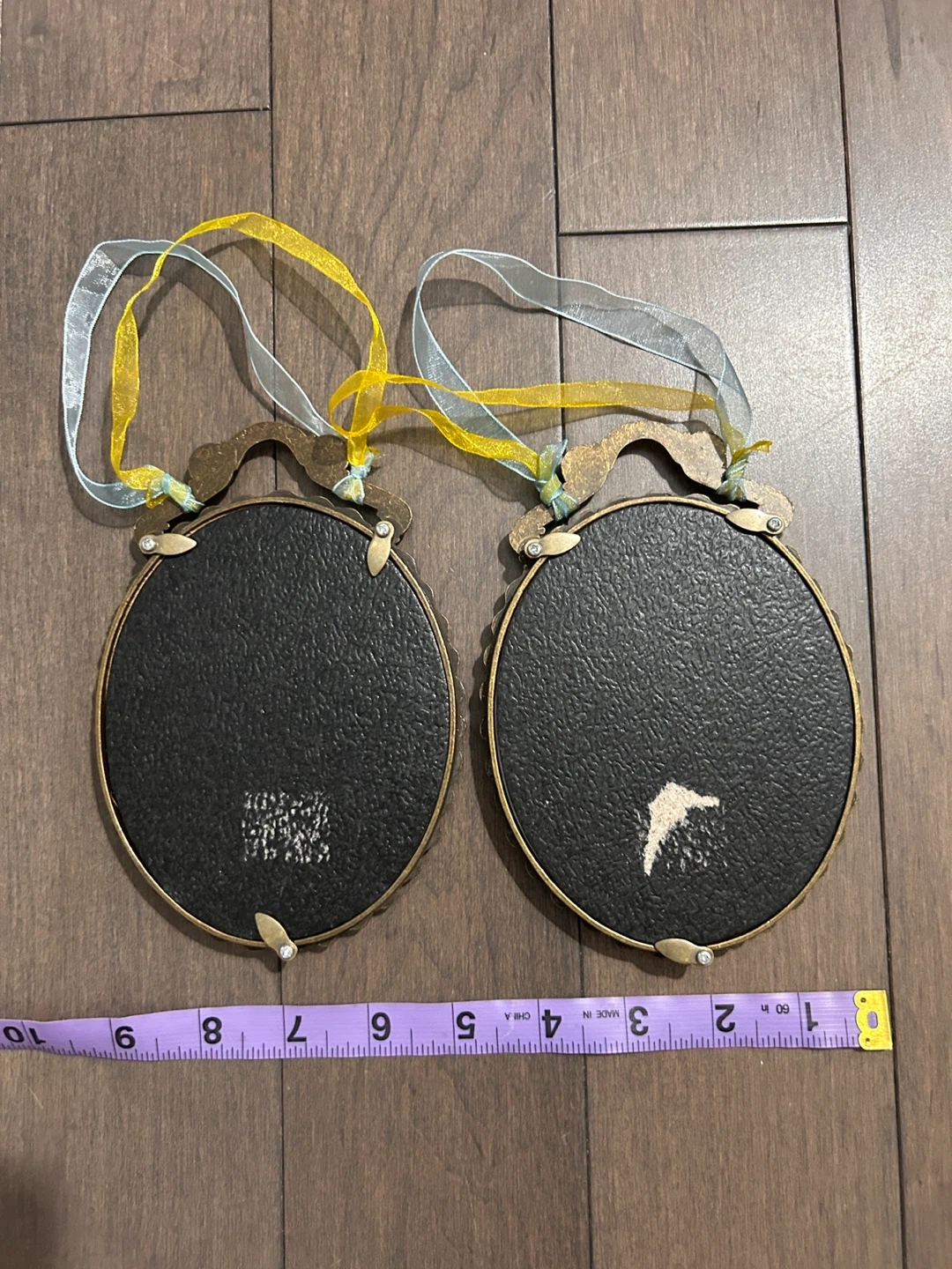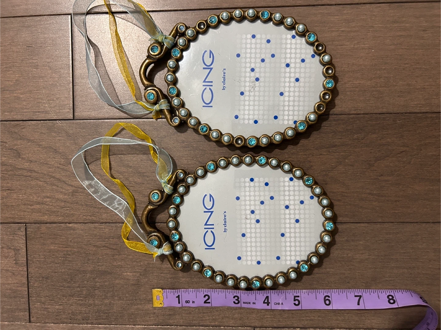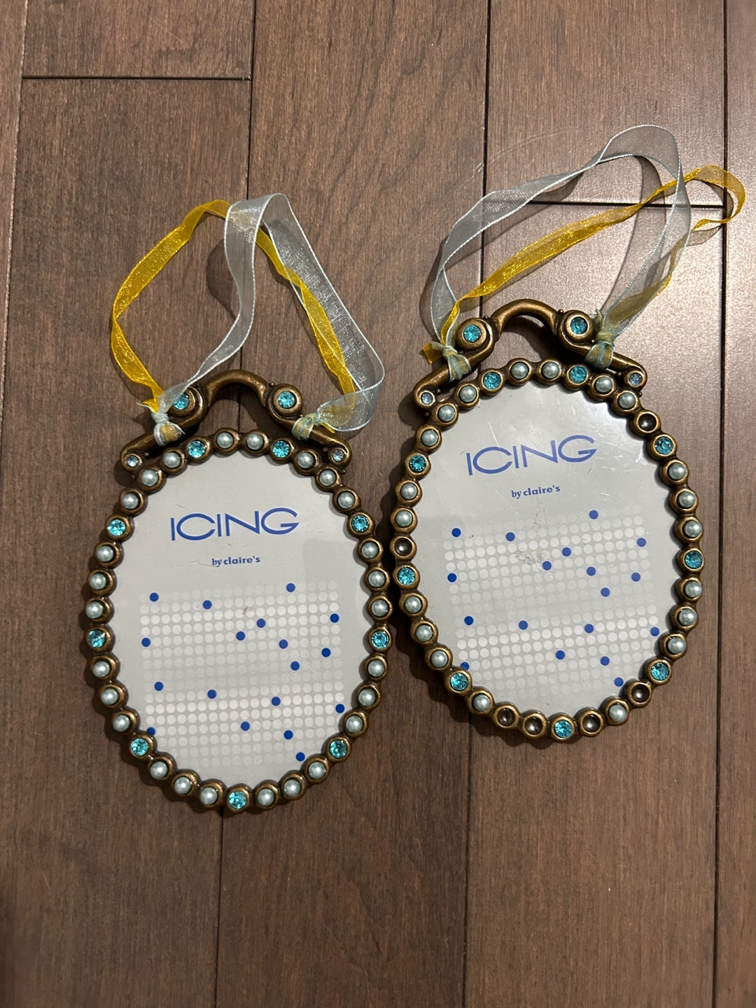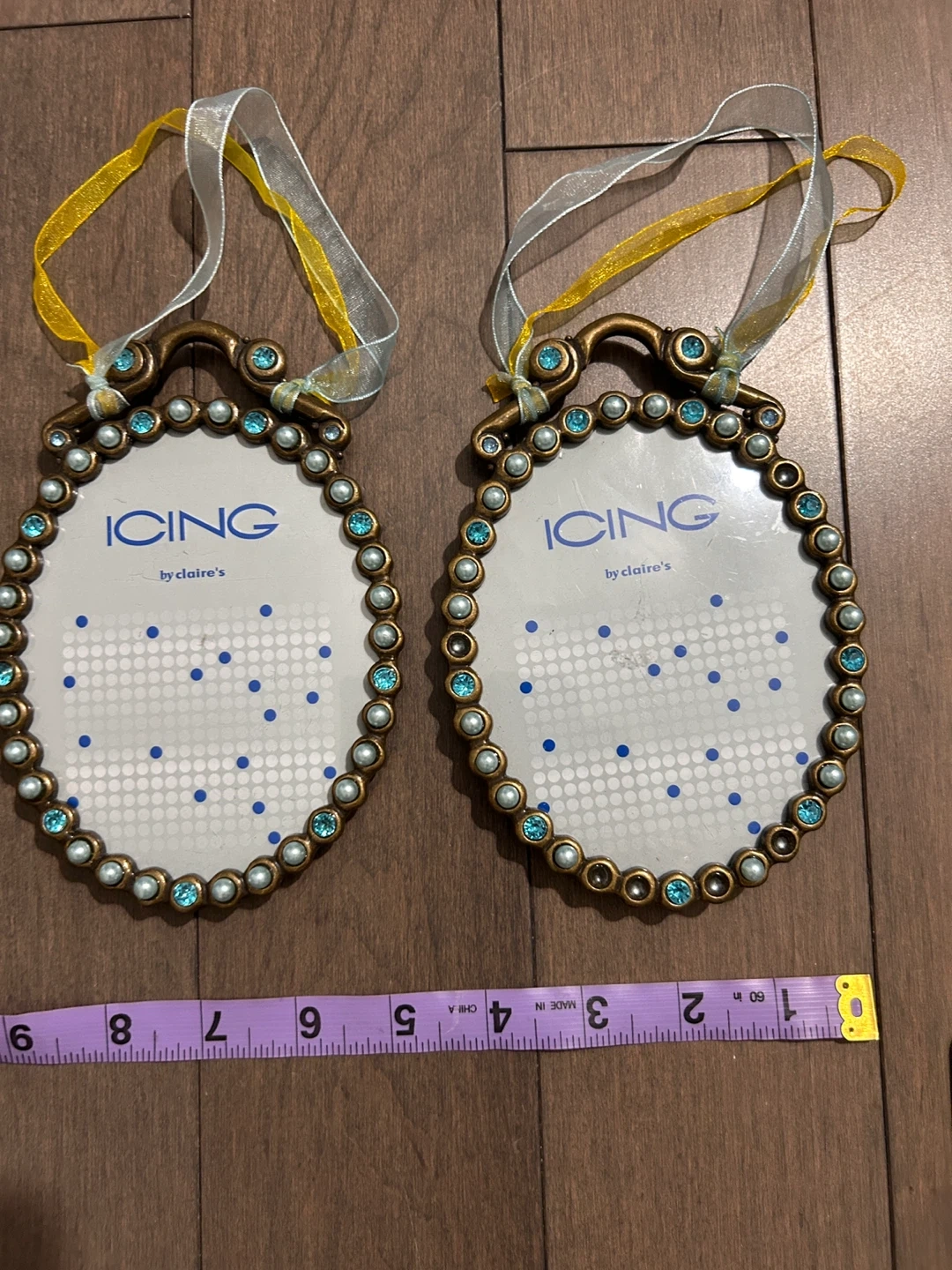 Selling two cute photo frame ornaments from Icing by Claire's! They're perfect for adding a personal touch to your holiday decor or as a sweet gift. Each frame is decorated with faux pearls and turquoise-coloured gems and has a ribbon for easy hanging. They measure approximately 4 inches wide and 6 inches tall