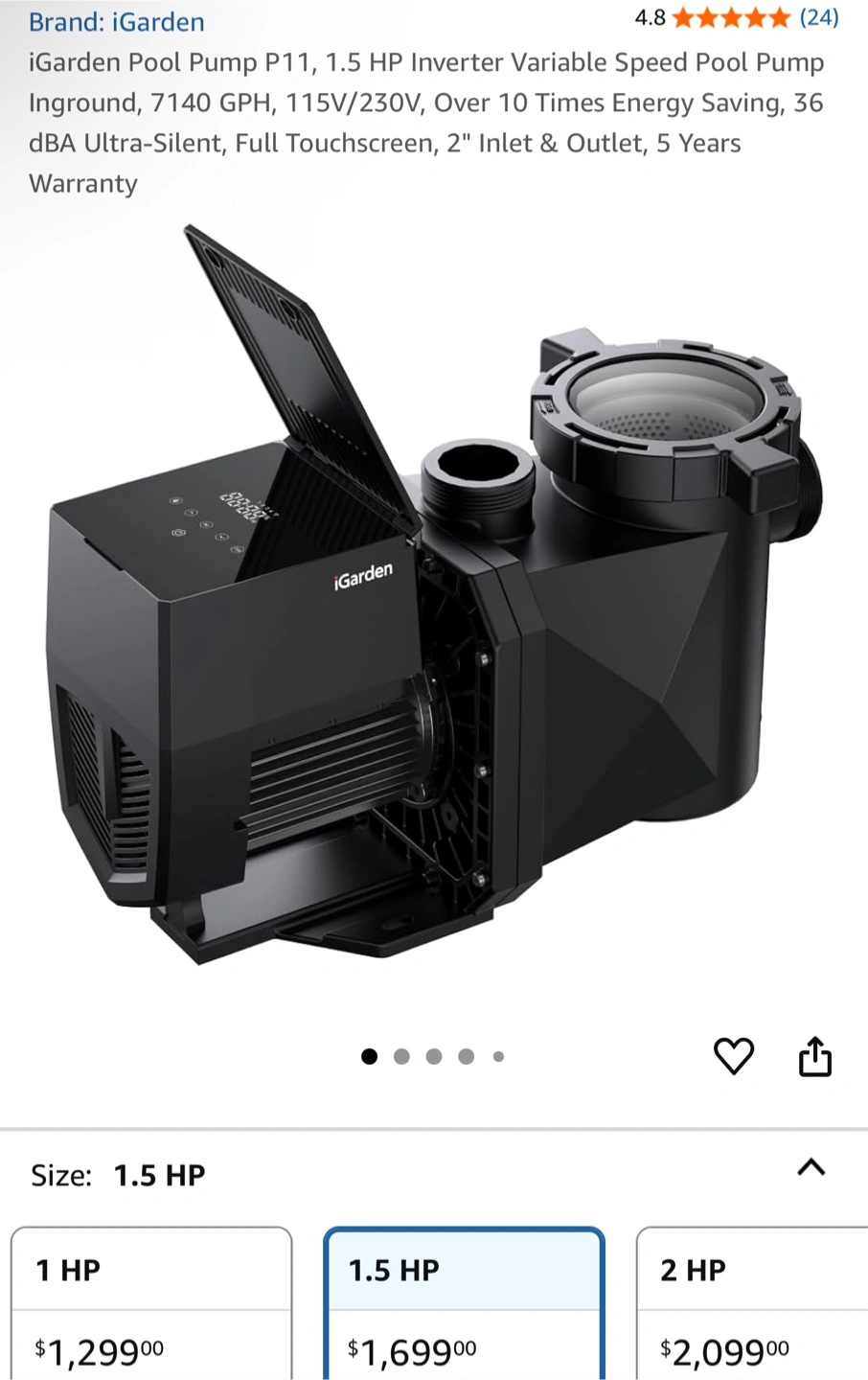 Selling a brand new in box iGarden Pool Pump P11, which is a 1.5 HP Inverter Variable Speed Pool Pump. It's designed for inground pools and has a 7140 GPH flow rate. It operates at 115V/230V and offers over 10 times energy saving. It's ultra-silent at 36 dBA and features a full touchscreen, with a 2" inlet & outlet. Retails for $1,699 but asking just $1000 OBO as we no longer have use for it and would like to clear out quickly. Pickup only!