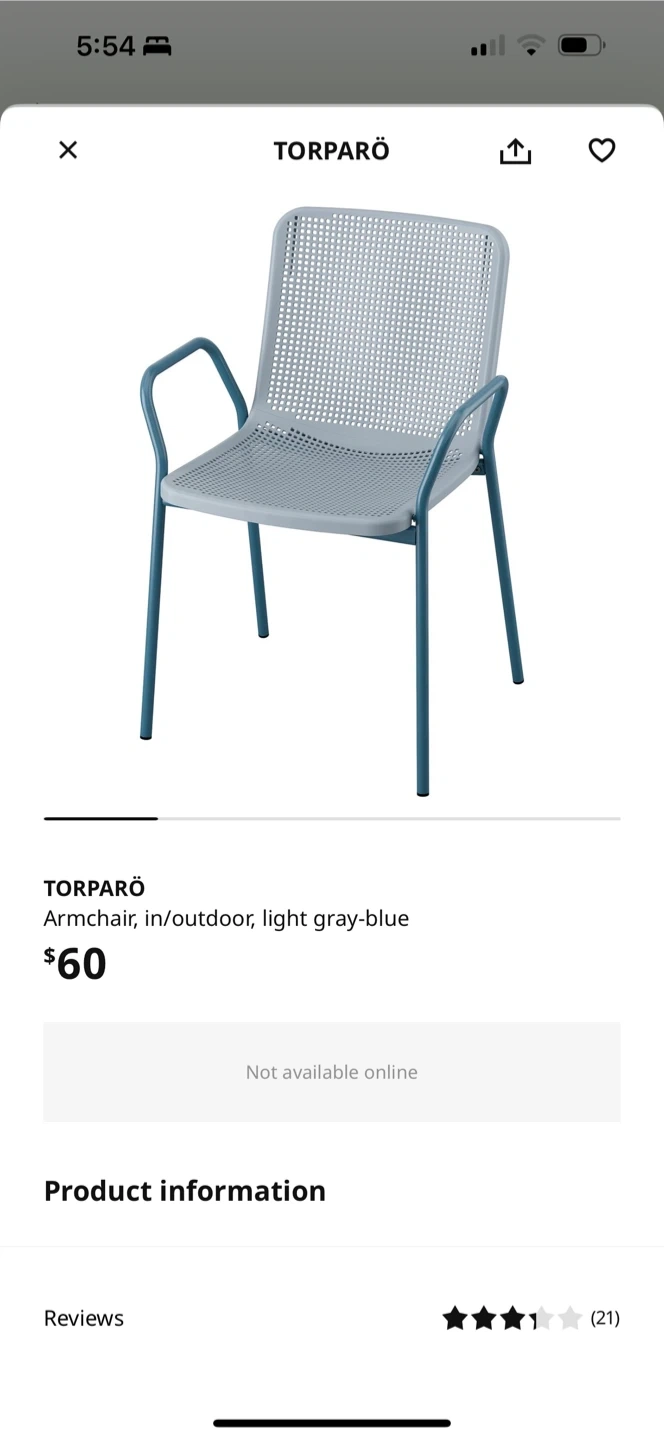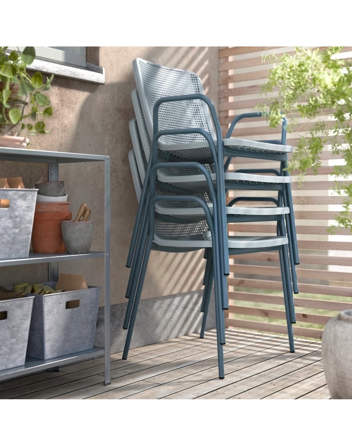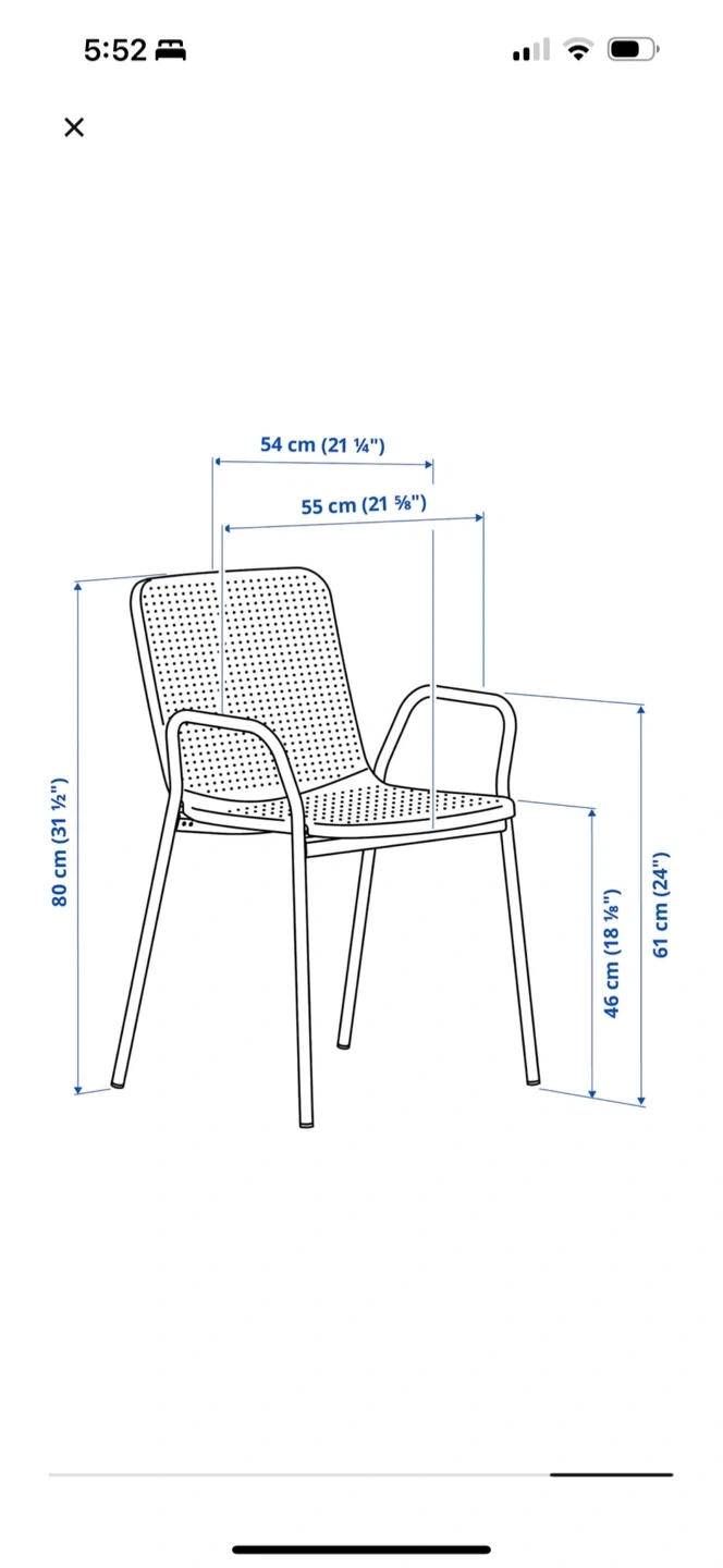 Selling a light grey and blue IKEA Skarpö armchair perfect for outdoor use! Key specs: - Dimensions: 54 cm (21 1/4") wide, 55 cm (21 1/4") deep, 80 cm (31 1/2") high - Seat height: 46 cm (18 1/8") - Seat depth: 46 cm (18 1/8") - Armrest height: 61cm (24") It's lightweight and easy to move around your patio or balcony