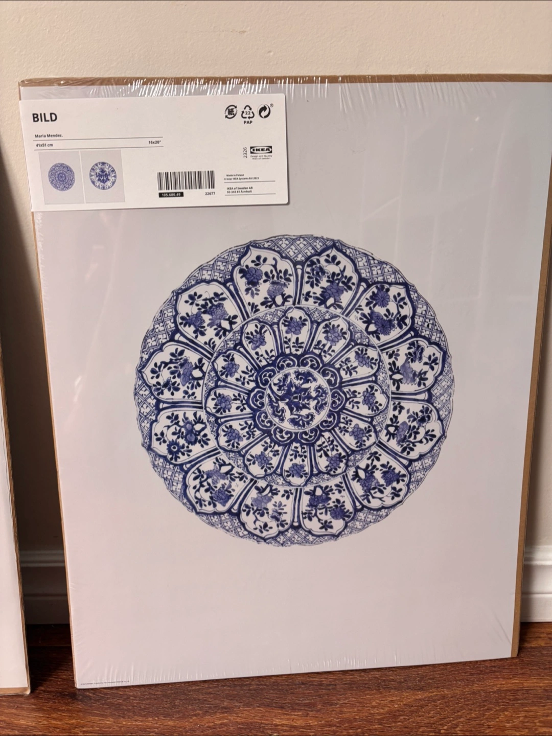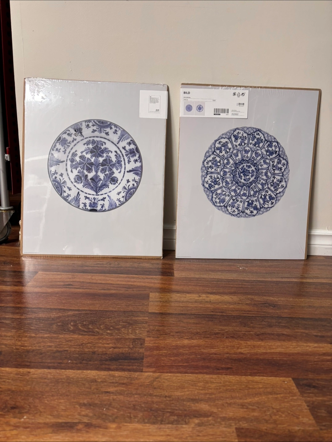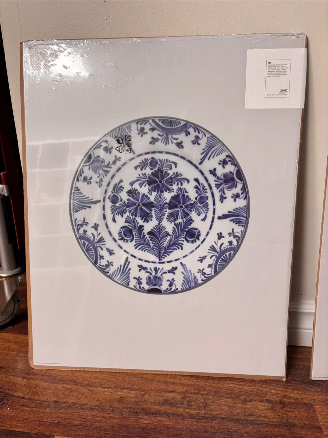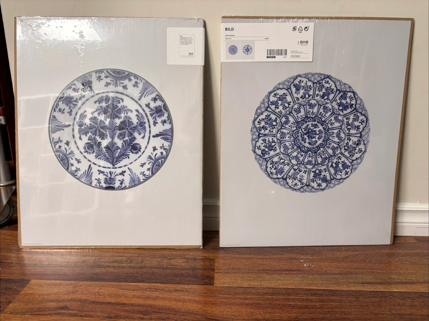 Two new IKEA BILD framed prints. Blue and white porcelain plate designs. Still in original packaging.