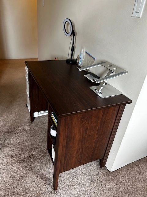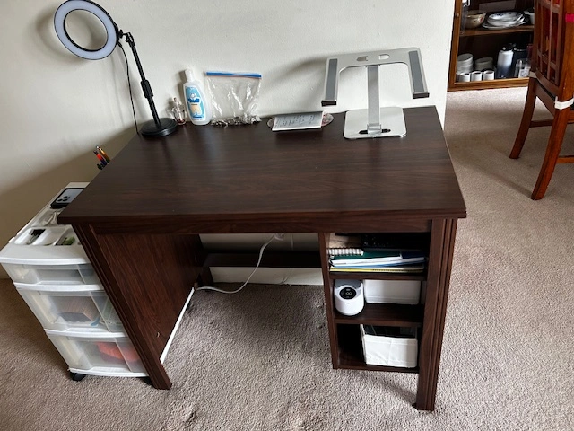 Selling a sturdy brown wood desk, perfect for a home office or study space! It features built-in shelves for extra storage and organization. It's in great condition and ready for a new home