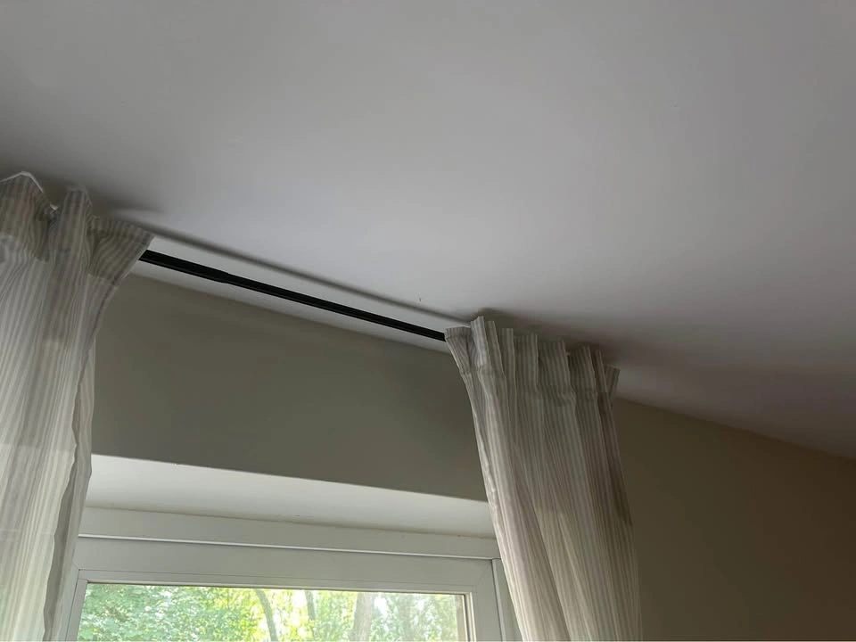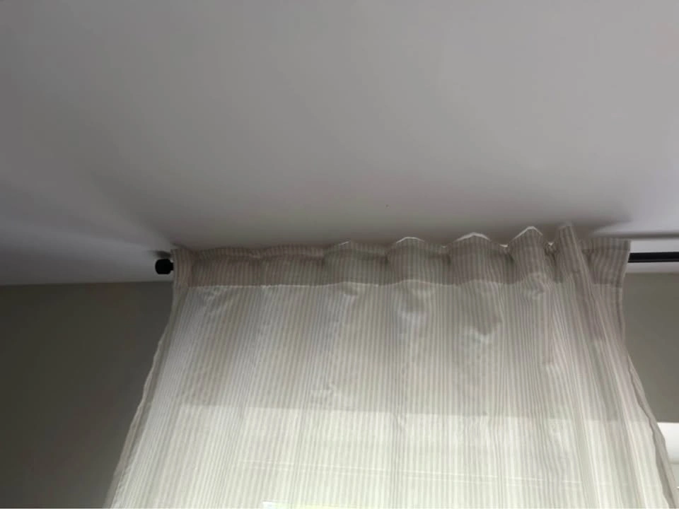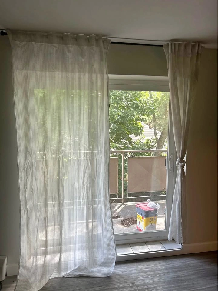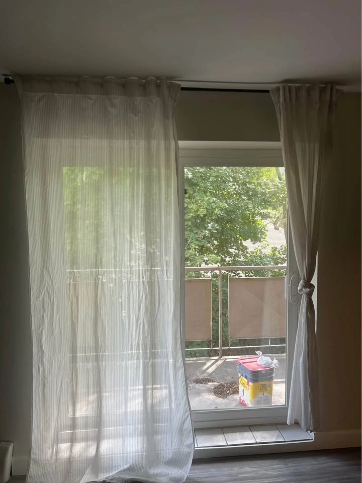 Perfect condition. Can buy separate or together. $10 each. IKEA links below: https://www.ikea.com/ca/en/p/bymott-curtains-1-pair-white-light-gray-striped-with-heading-tape-00466683/#content https://www.ikea.com/ca/en/p/raecka-curtain-rod-combination-black-s99929241/