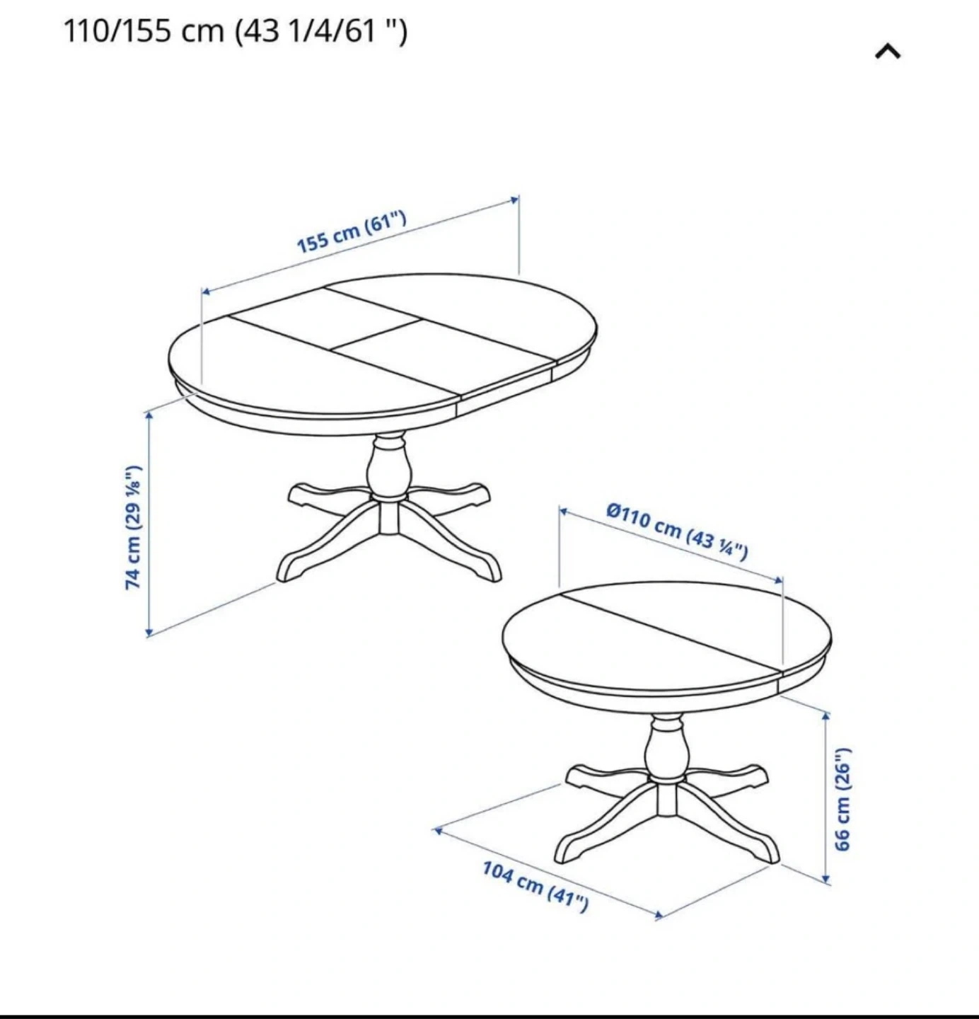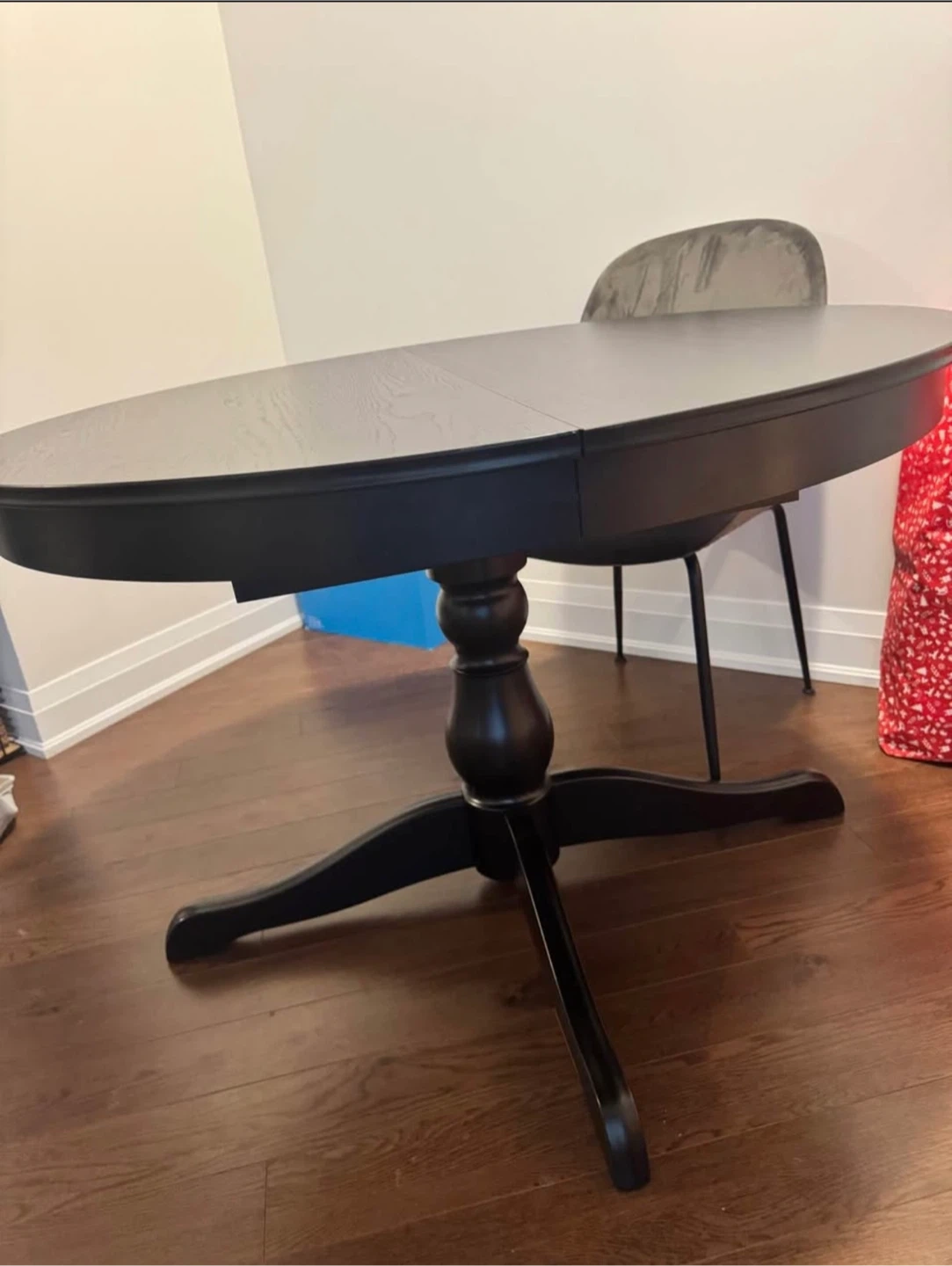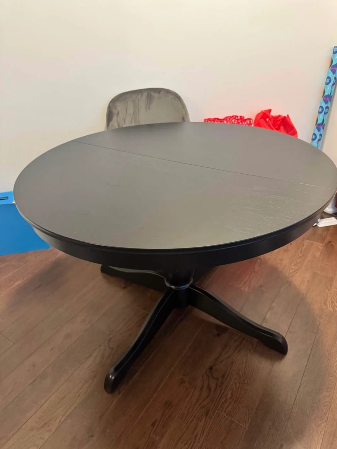 Selling a used IKEA extendable dining table in black. It's in good condition and perfect for smaller spaces that need flexibility. The table extends from 110cm to 155cm, offering extra space when needed. Dimensions are 110/155 cm (43 1/4/61 ").