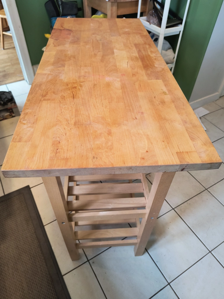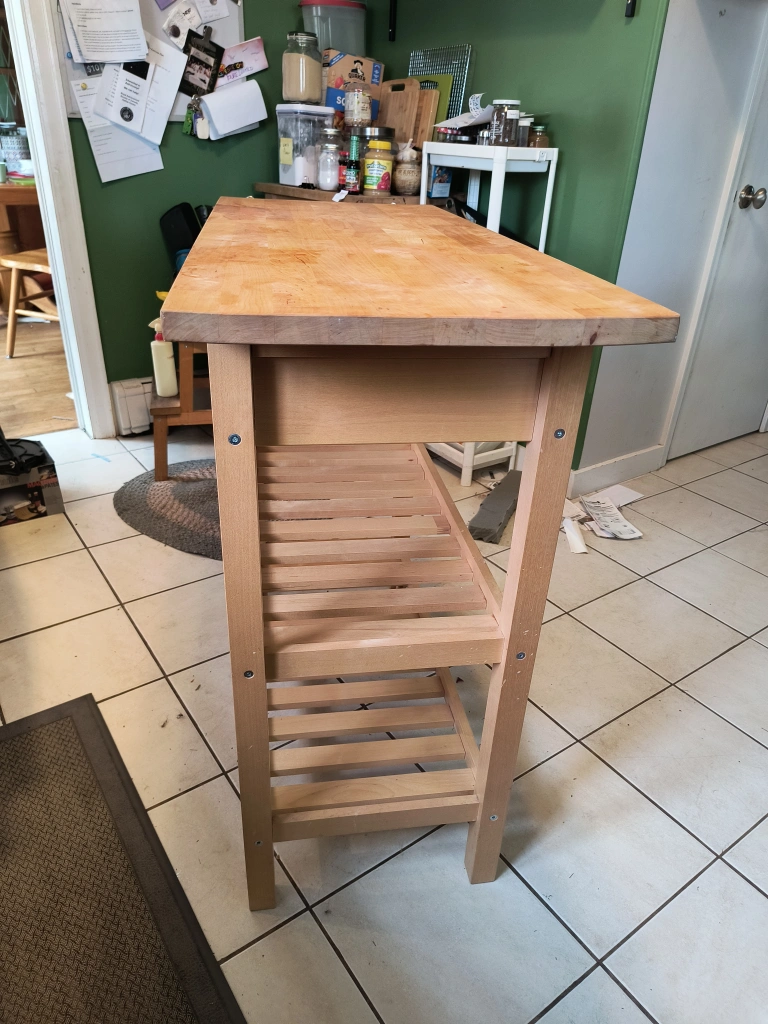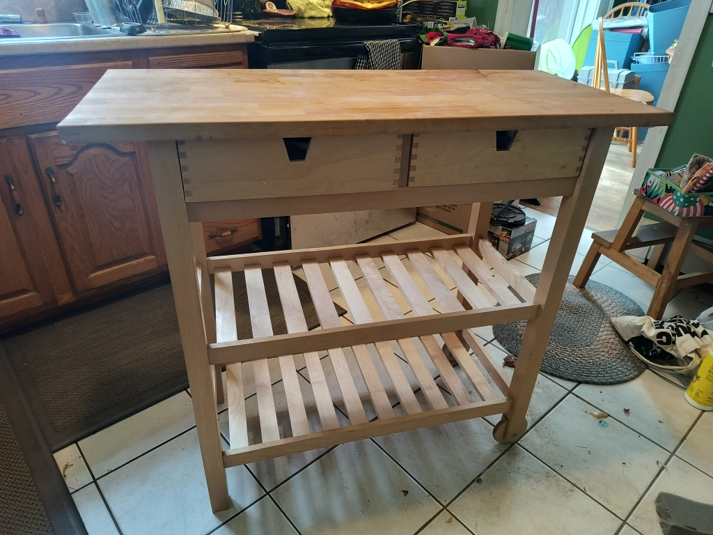 Selling an Ikea FÖRHÖJA wooden kitchen island cart. It's got a nice, sturdy build with a butcher block style top. It features two drawers and two shelves for storage. Perfect for adding extra counter space and storage to your kitchen! See https://www.ikea.com/ca/en/p/foerhoeja-kitchen-cart-birch-80035920/