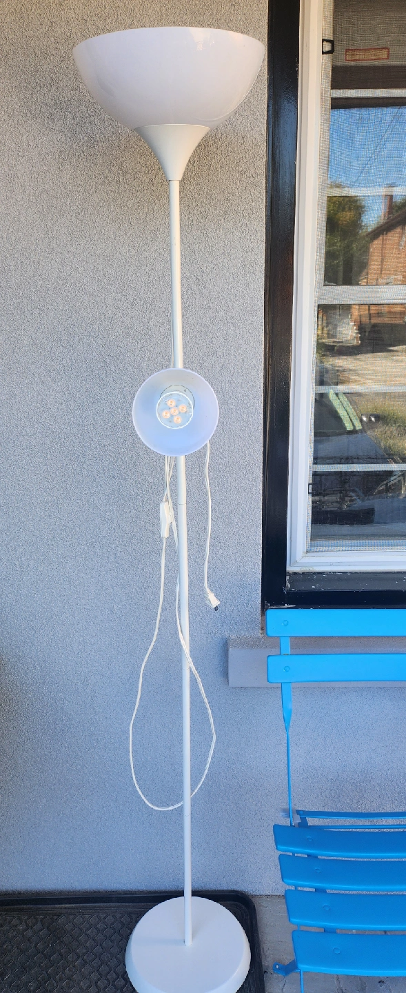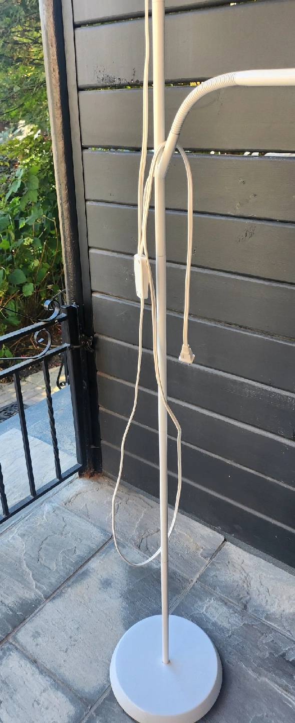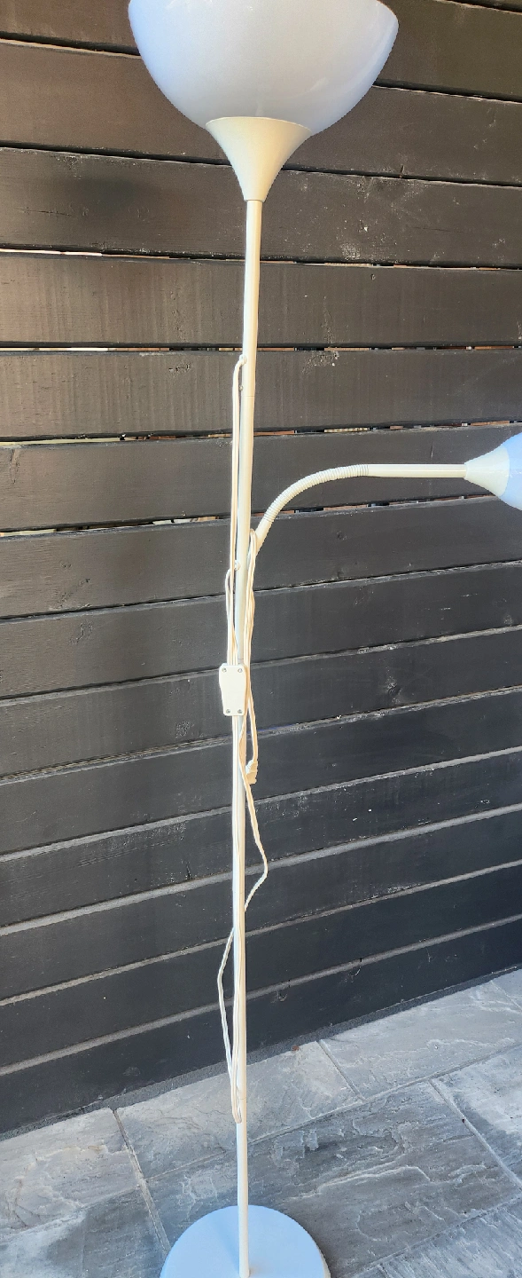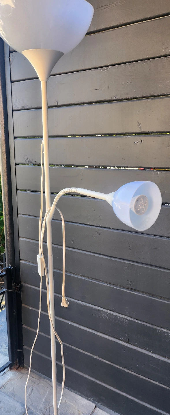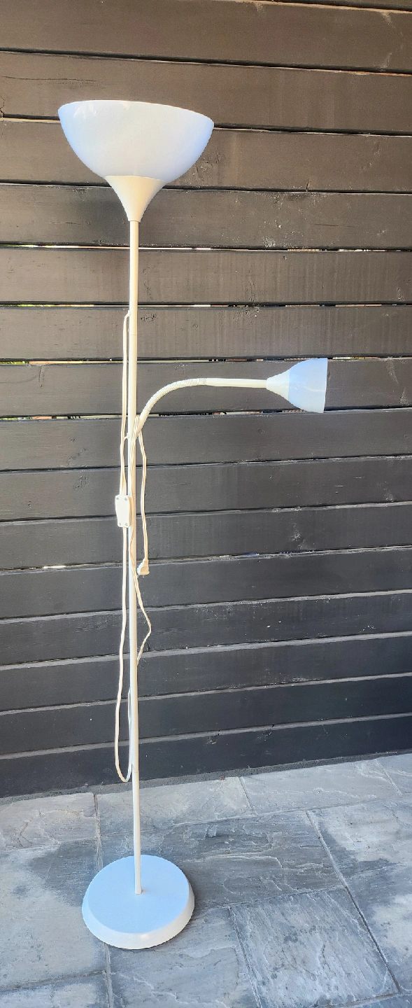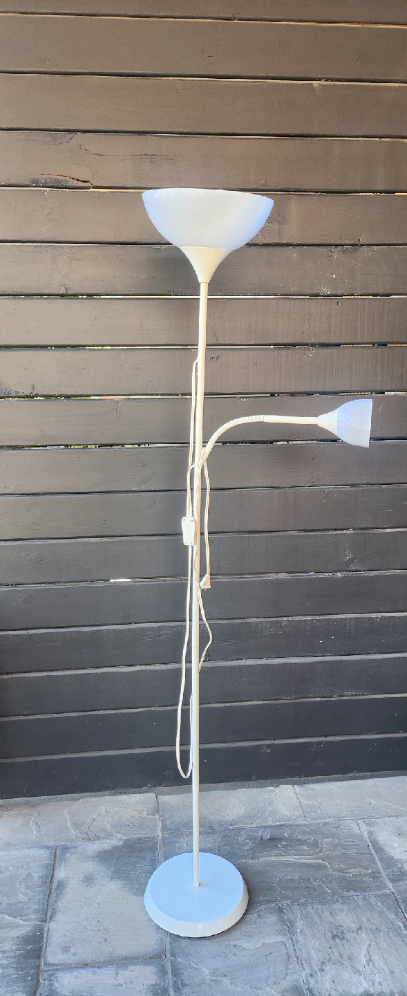 Selling a white IKEA floor lamp! It has a main upward-facing light and an adjustable reading light. Perfect for adding some extra light to any room