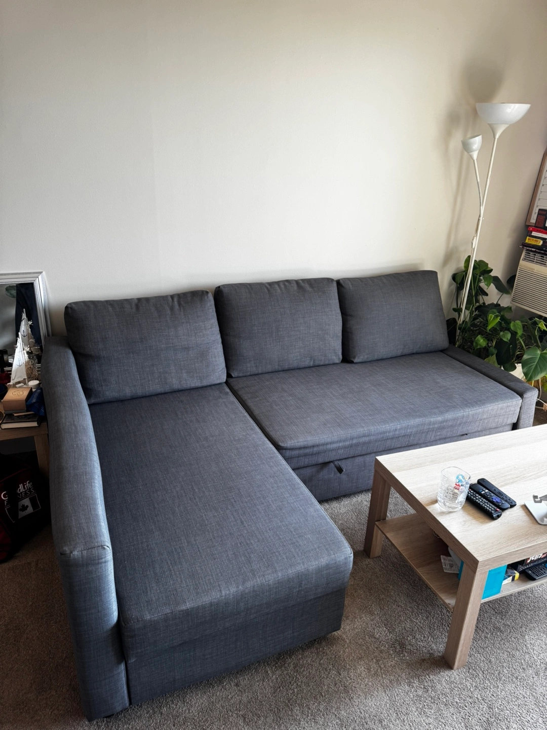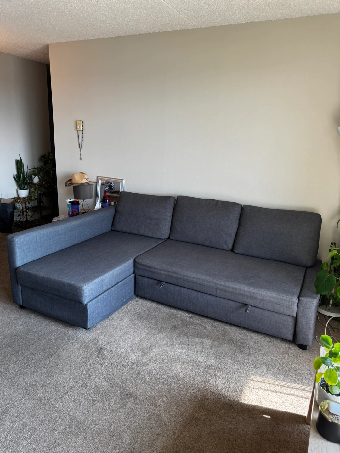 Selling a grey IKEA Friheten sleeper sectional! It's in great condition and perfect for small spaces. This versatile sofa easily converts into a bed, making it ideal for guests or cozy movie nights. It also has built-in storage for your blankets and pillows. A great addition to any home!