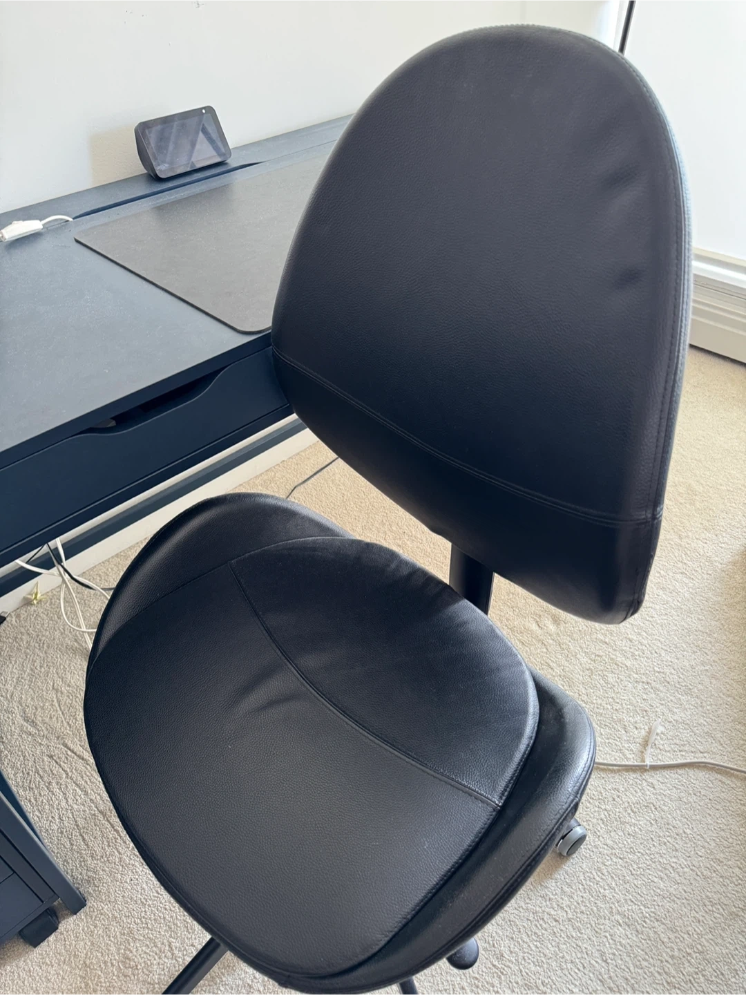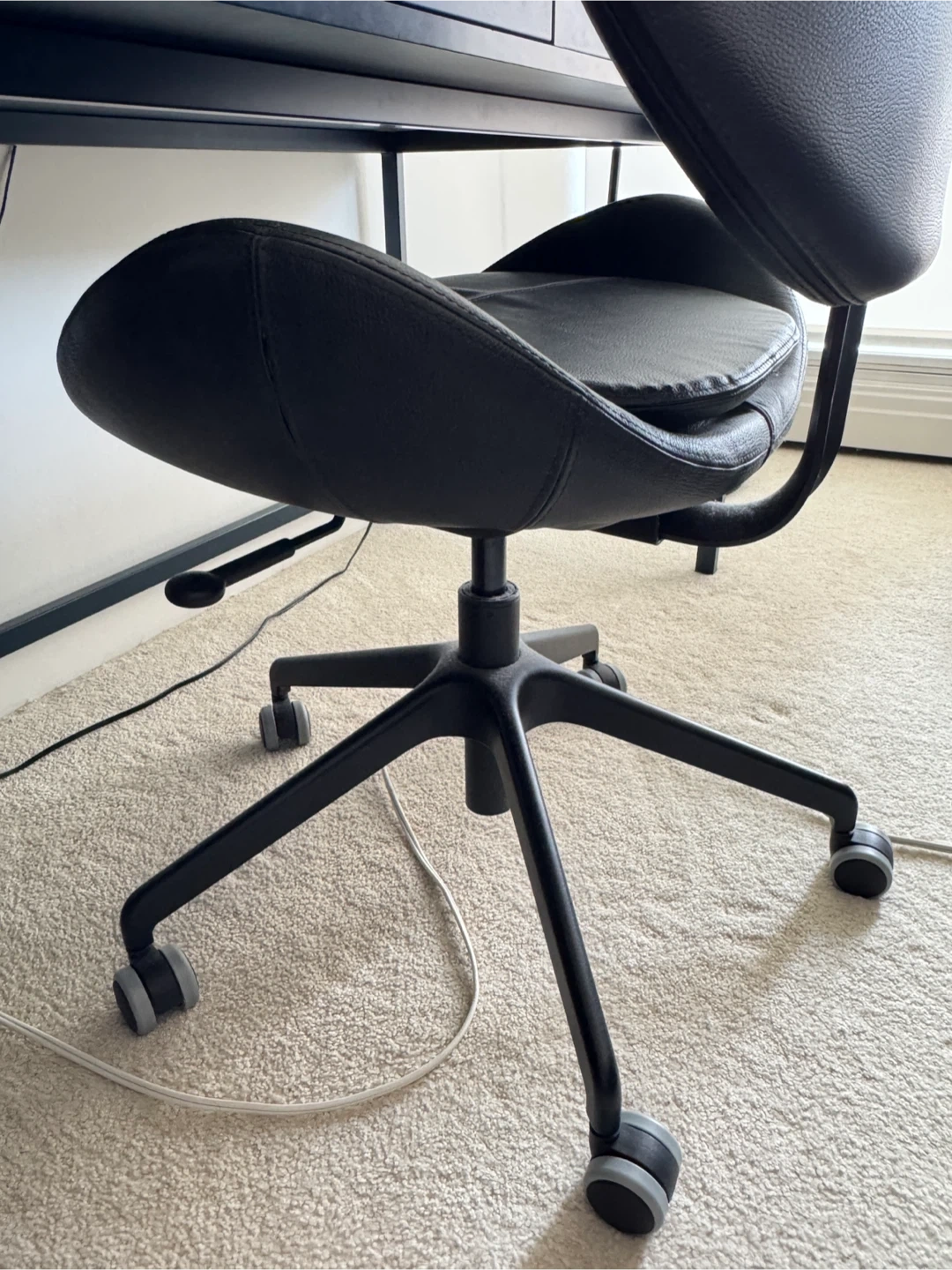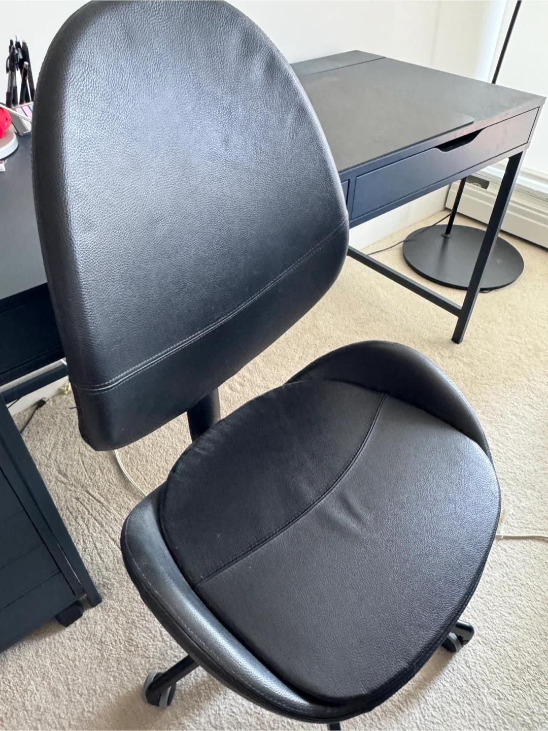 Selling a gently used black office chair. It's in great shape and perfect for a home office or study space. The chair features a comfortable seat and back, and it rolls smoothly. It's a simple and functional design that will fit well in any room IKEA no longer make these chairs in leather. This ergonomic office chair has many features to keep you comfy and focused, such as a synchronized tilt mechanism that allows your body to move more, which improves blood circulation.