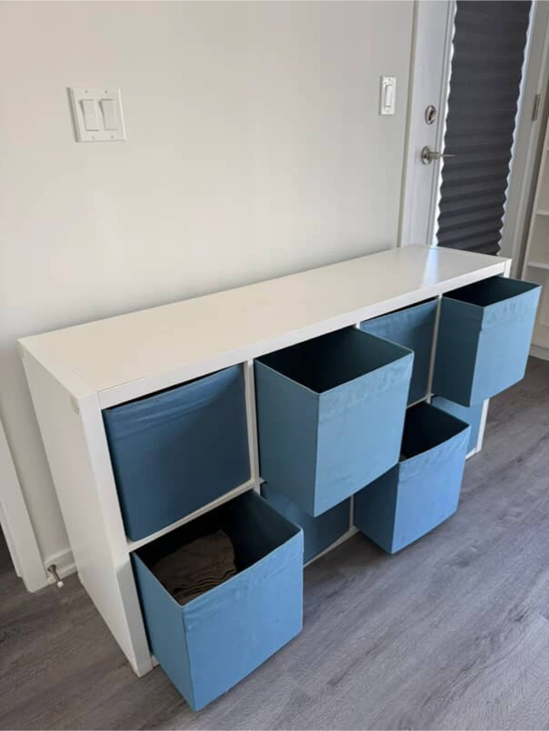 Selling an IKEA Kallax shelf unit! It comes with the blue fabric baskets shown in the picture. This unit is perfect for organizing toys, books, or anything else you need to keep tidy. The shelf is in great condition and ready for a new home!