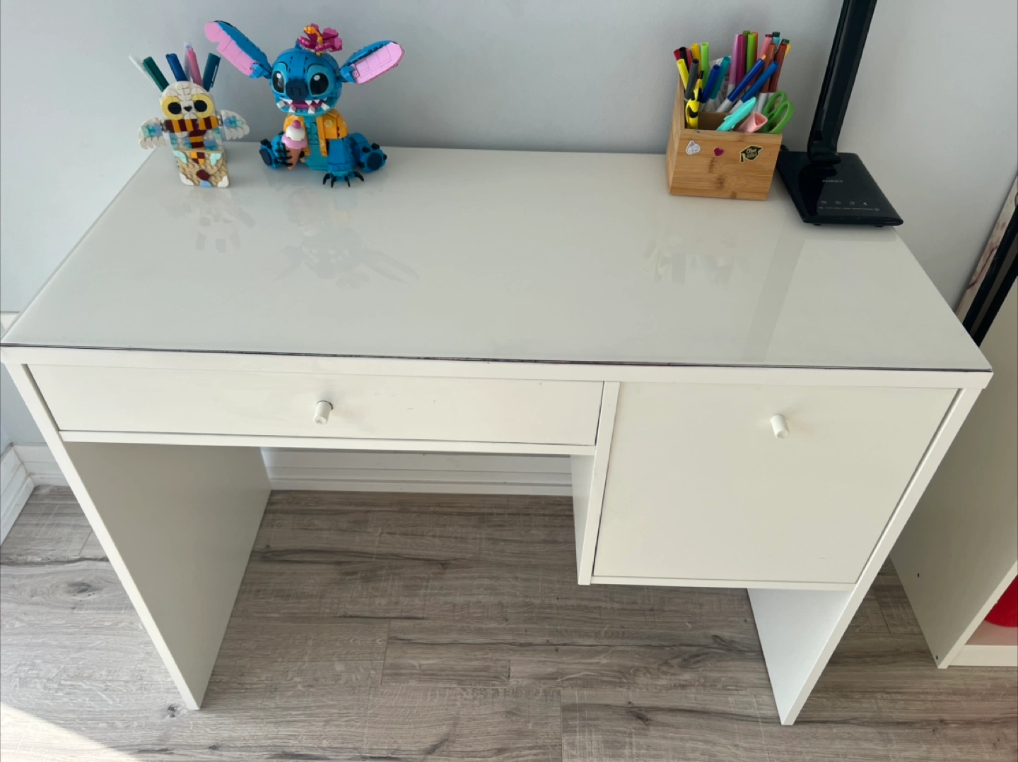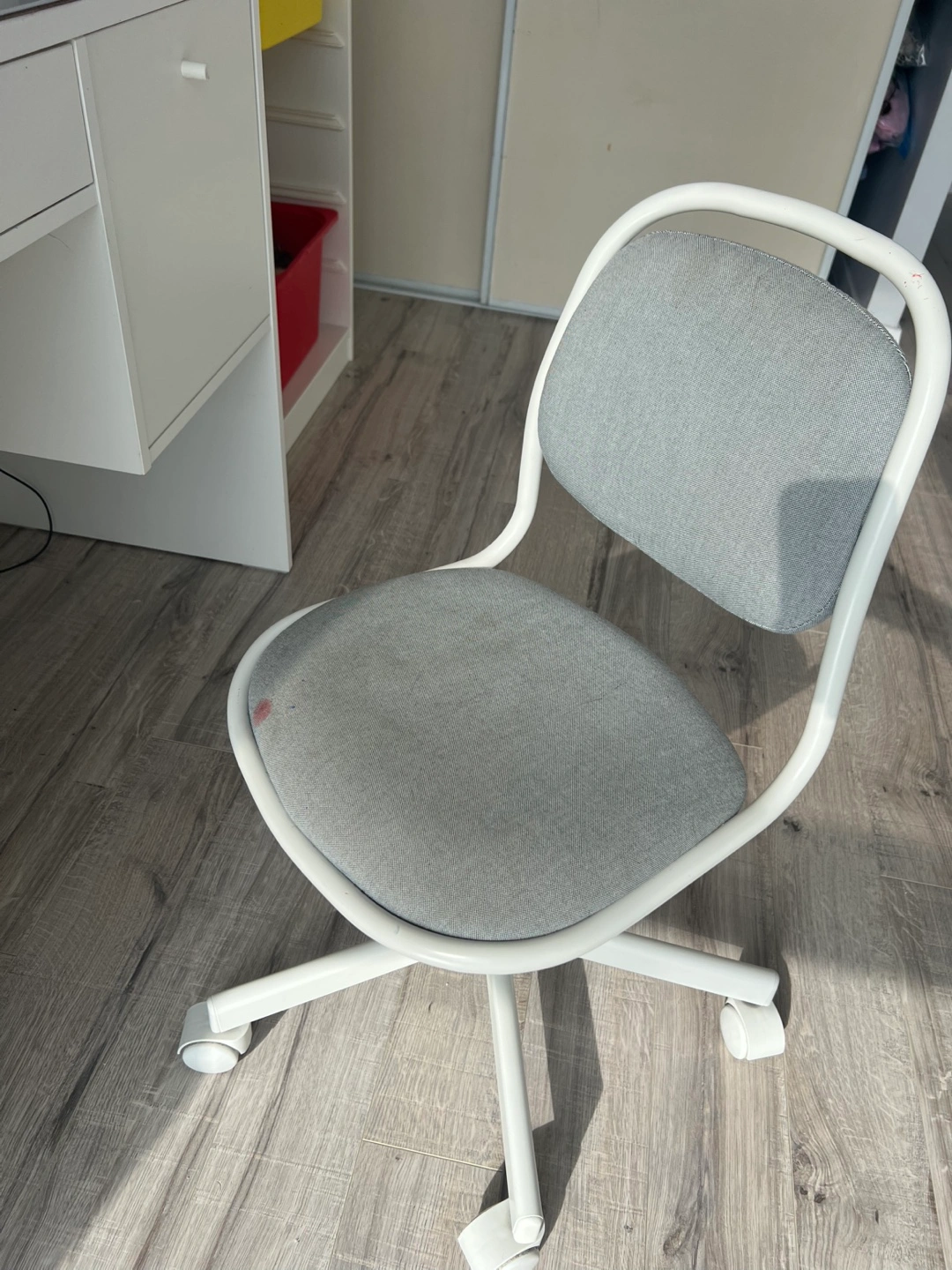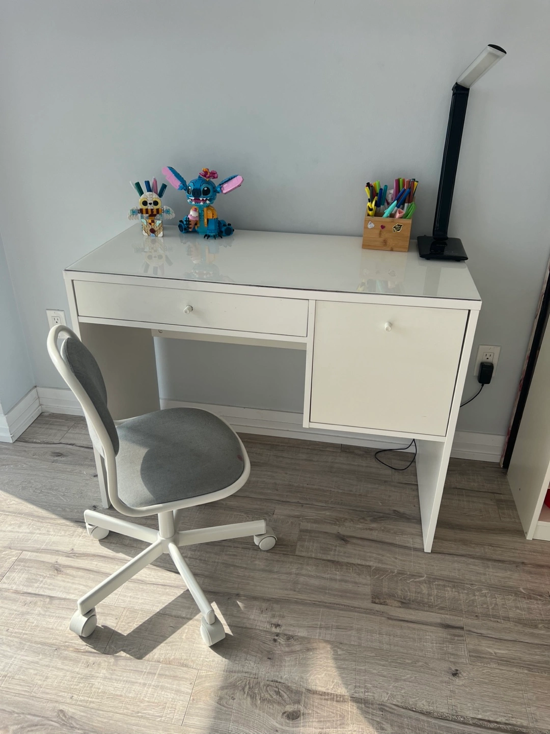 Selling a white desk and grey chair set. The desk features a clean design with a drawer and a cabinet for storage. The chair is a comfortable grey colour with a white frame. Perfect for a student or home office setup! 39.2”X 19” X H ~ 31”