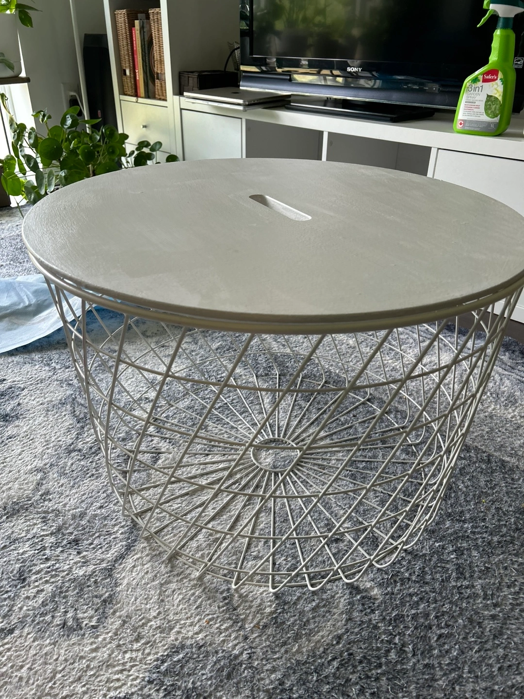 In good to okay condition. The paint had chipped off slightly on the white top surface so I repainted it with furniture white paint and added a top coat to it (see pictures). This sells for $99 plus tax in IKEA right now so you get a pretty sweet deal with this!