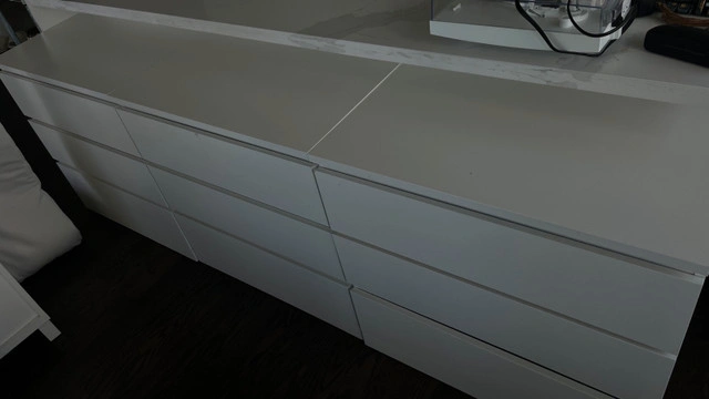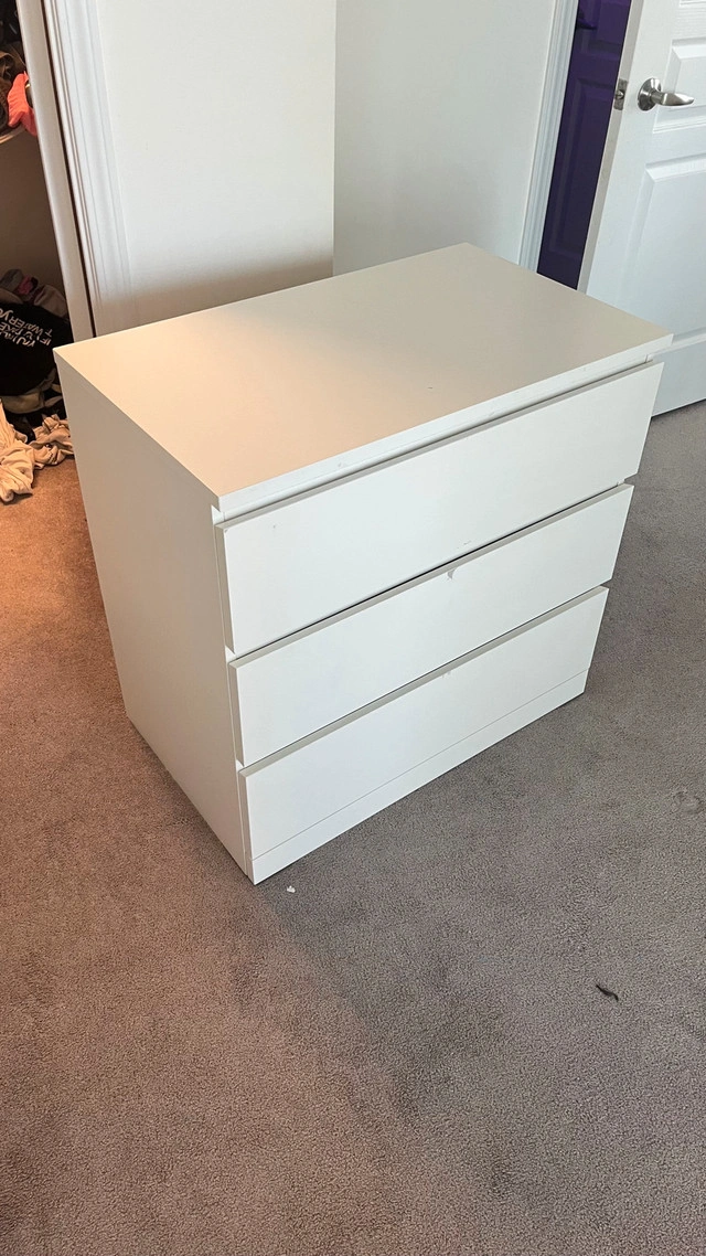 Selling a white IKEA Malm dresser with three drawers. It's in ok condition and perfect for adding storage to any room. There is a small mark on the top of the dressers. Please see pictures. I’m selling one for $40 and 3 dressers for $100