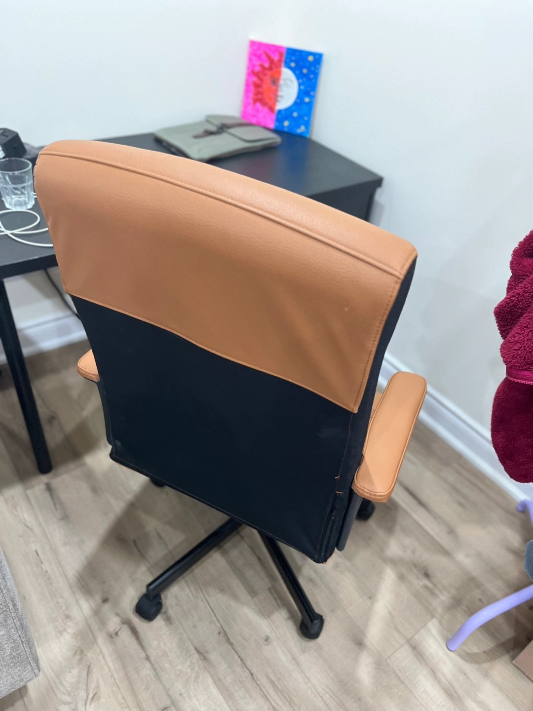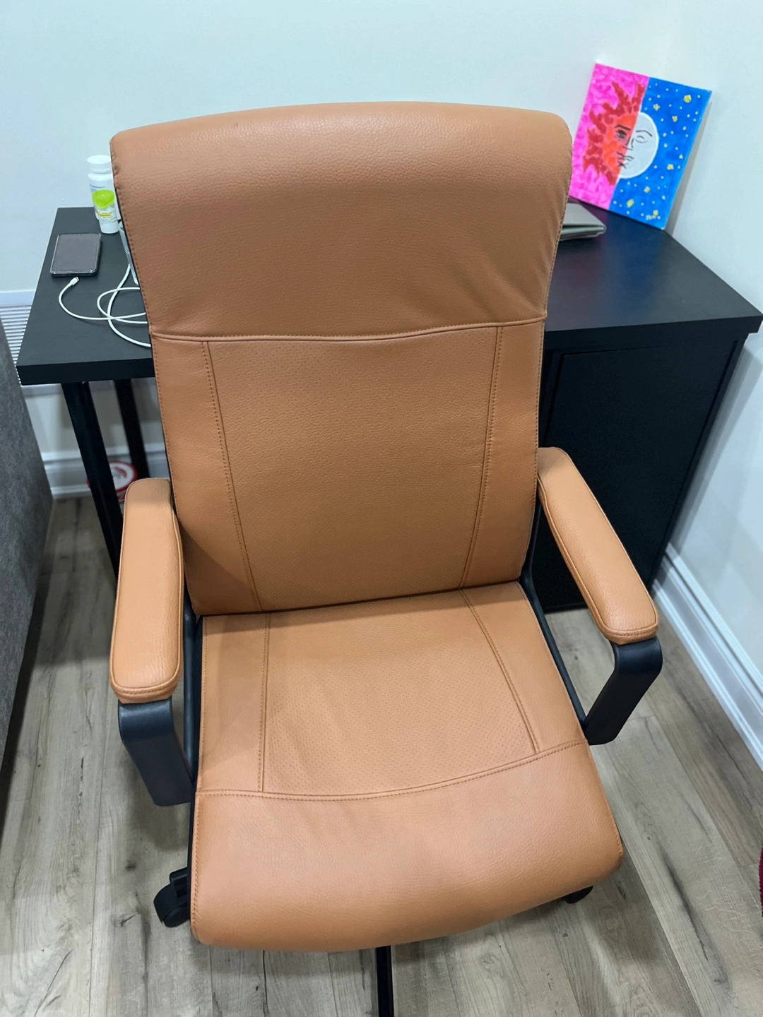 Selling a comfortable office chair in tan and black. It features a high back for good support during long work sessions. The chair is in good condition and ready to use in your home office