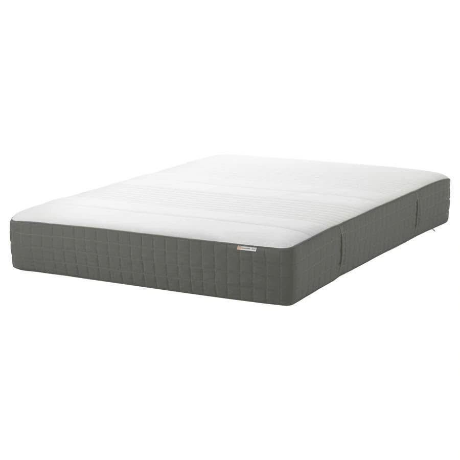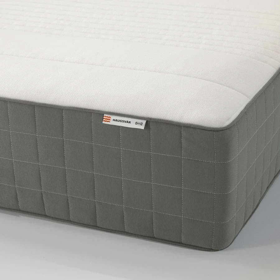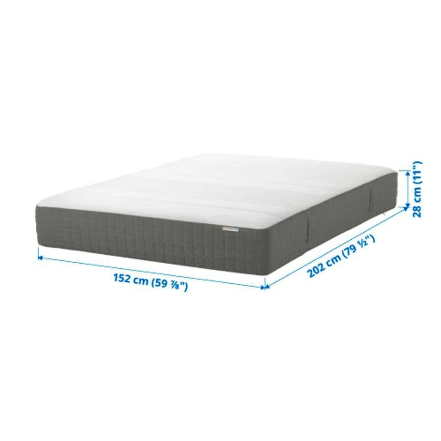 IKEA - HAUGSVÄR Queen Hybrid mattress, firm/dark gray Measurements: Length: 6.6ft Width: 5ft Thickness: 11 " Comfortable HAUGSVÄR mattress with individually wrapped pocket springs that adapt to your body. Features a plush memory foam layer for pressure relief and better circulation. Soft top fabric moves with you for extra comfort, and motion-isolating coils ensure undisturbed sleep.