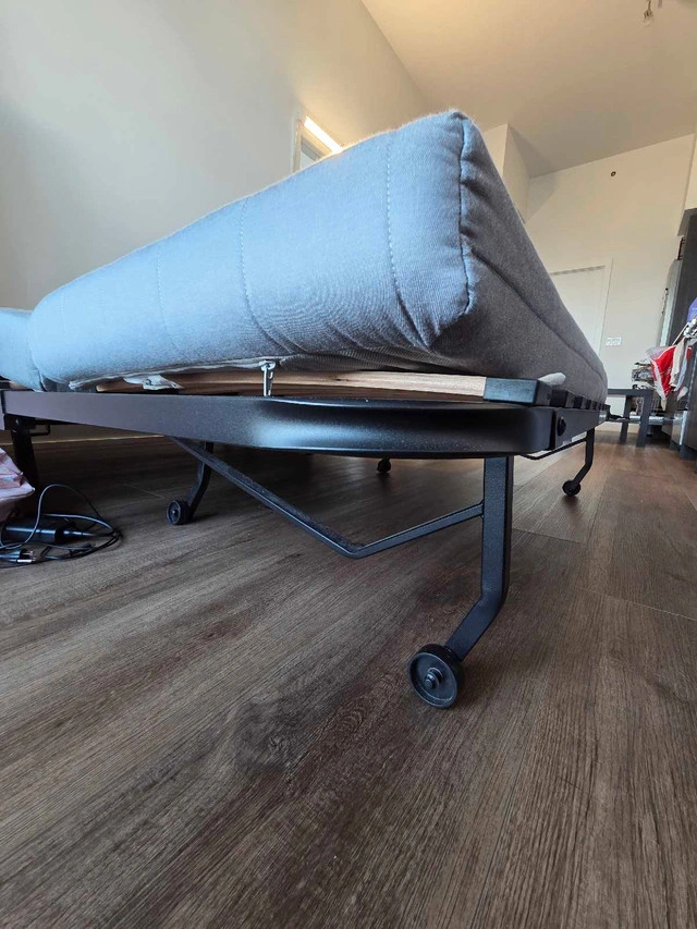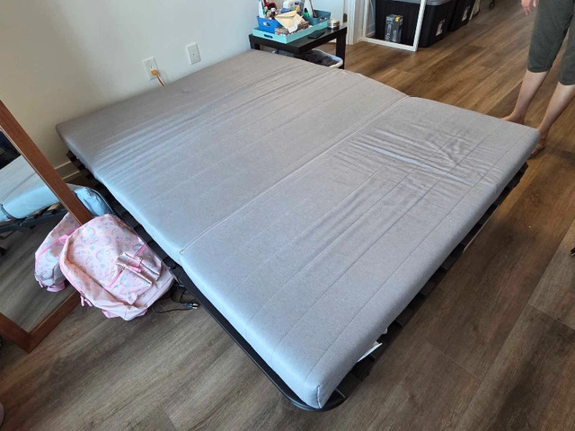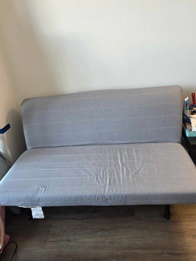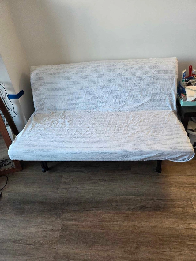 This used IKEA futon is perfect for small spaces or as an extra bed for guests; it easily converts from a sofa to a full-size bed. The futon has a durable metal frame and a comfortable mattress. The cover is removable and washable for easy maintenance. Here are some details: * **Type:** Futon / Sofa Bed * **Size:** Full * **Frame Material:** Metal * **Cover Material:** Washable Condition: Used - Like new Cash accepted: Yes