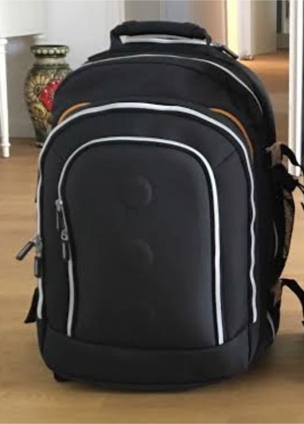 Selling Ikea Upptacka suite case with roller wheels in good condition. It's perfect for school, work, or travel. It features a sleek design with white accents and multiple compartments for organization. Can be converted into two backpacks.