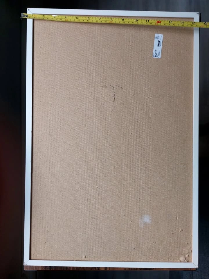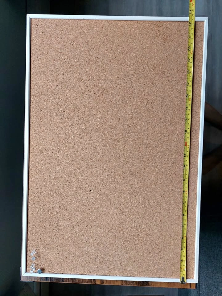 This is a cork board 39x58cm (15x23in). The front face and the frame are in good condition. The back has some punctures and a crack, as seen in the photograph. It is still structurally sound and very usable. You don’t notice the imperfections in use.