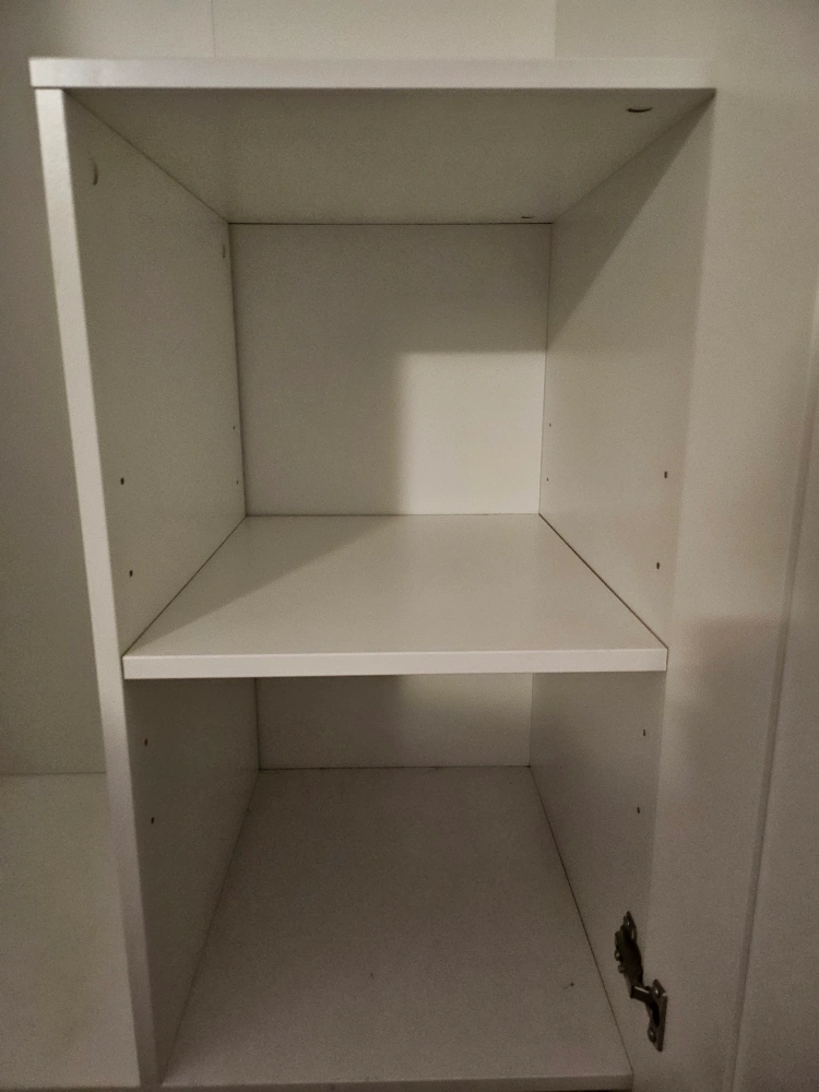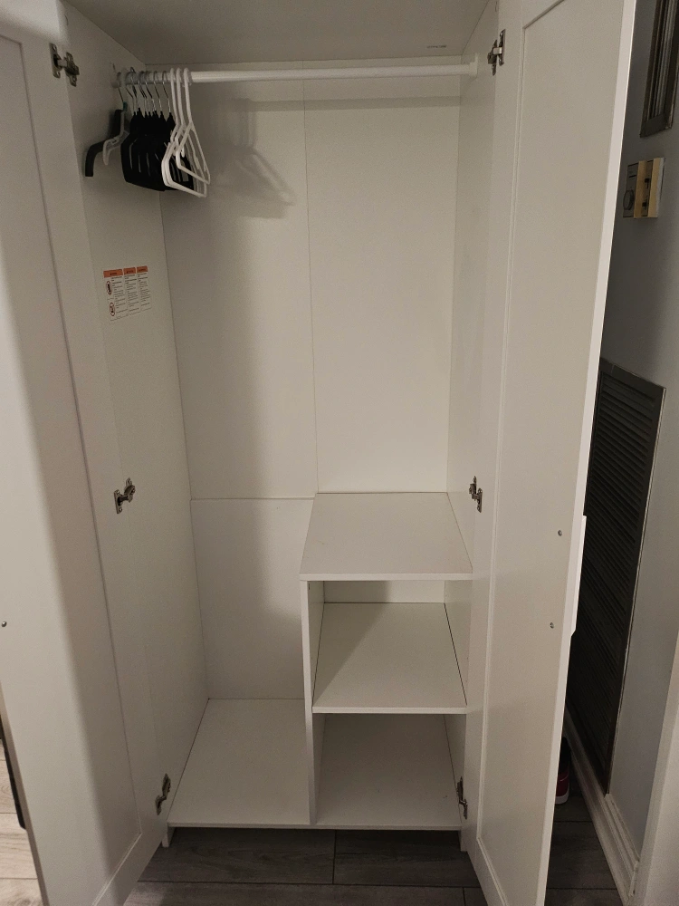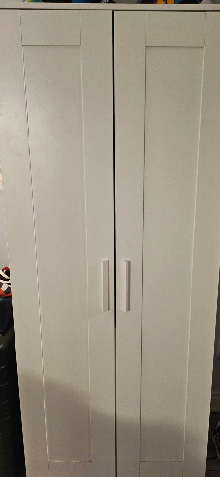 Selling a white wardrobe closet. It's in good condition and ready for a new home. Perfect for adding extra storage to any room! Inside wardrobe,one side is peeled off a bit.