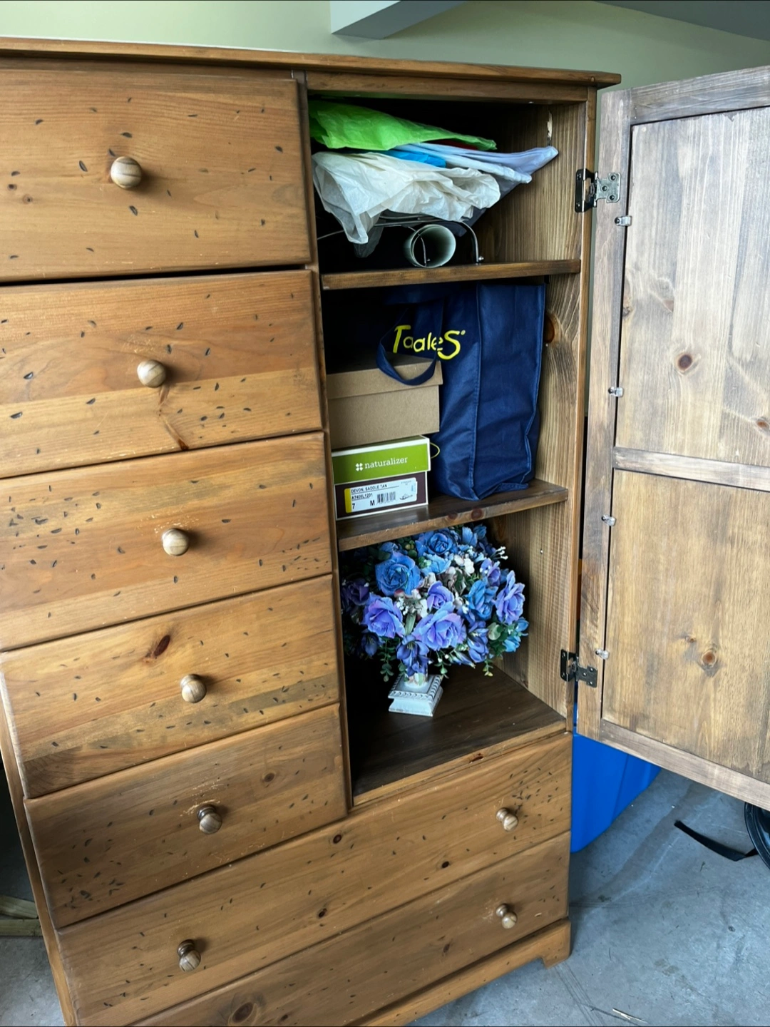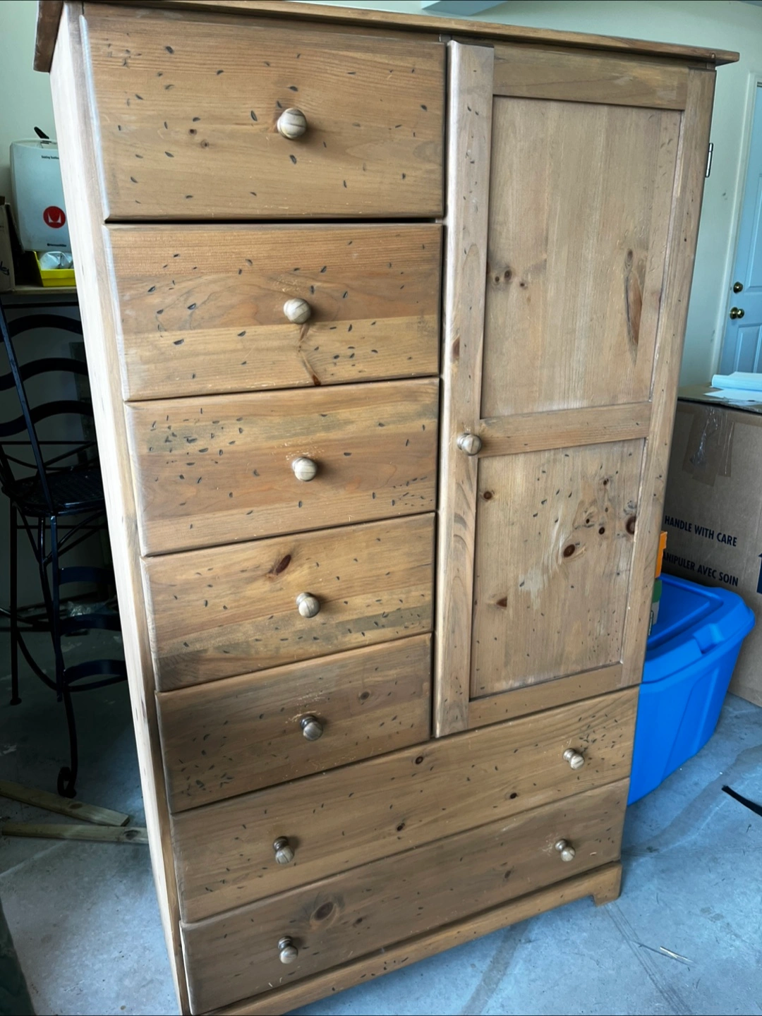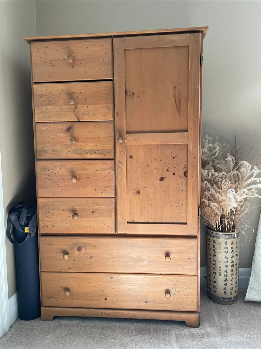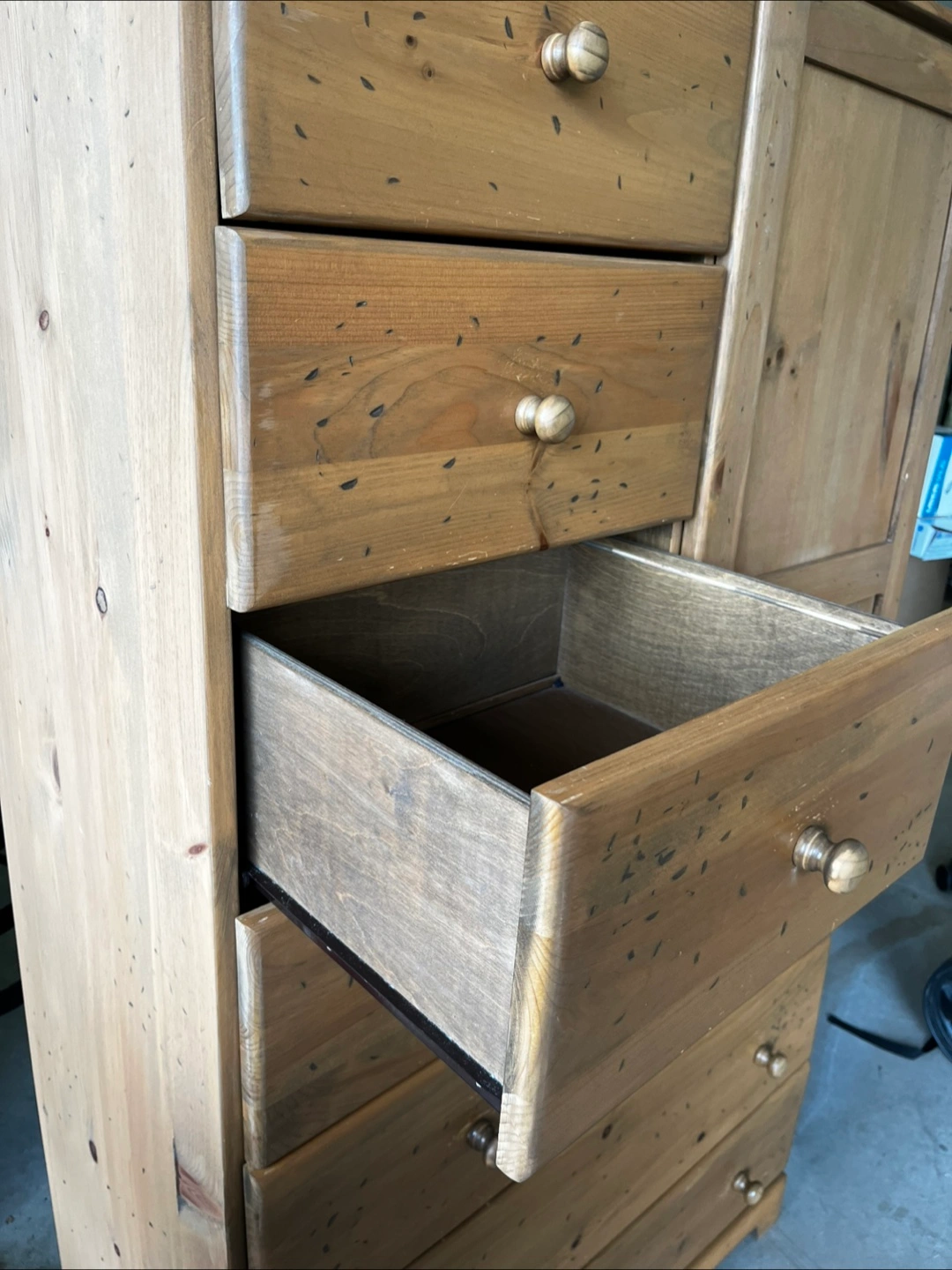 Wood armoire. Featuring numerous drawers and a side cabinet. Drawers with round knobs. The side cabinet opens to reveal shelving. A great storage solution, perfect for any bedroom or living space, would be using this piece.