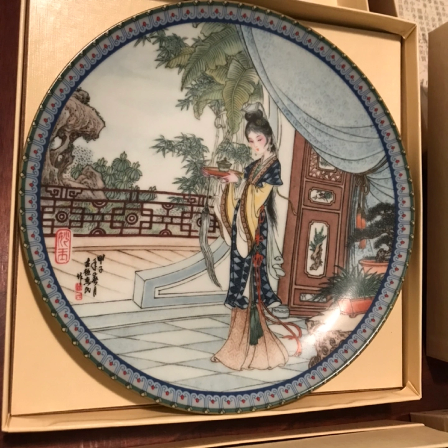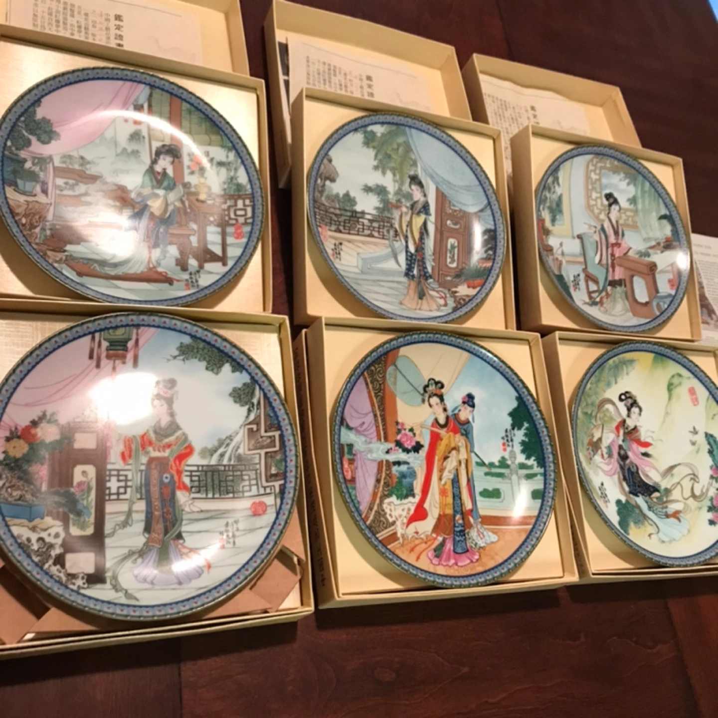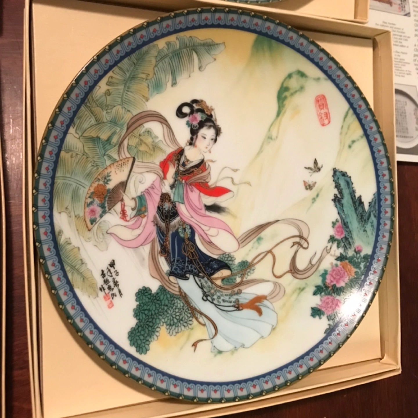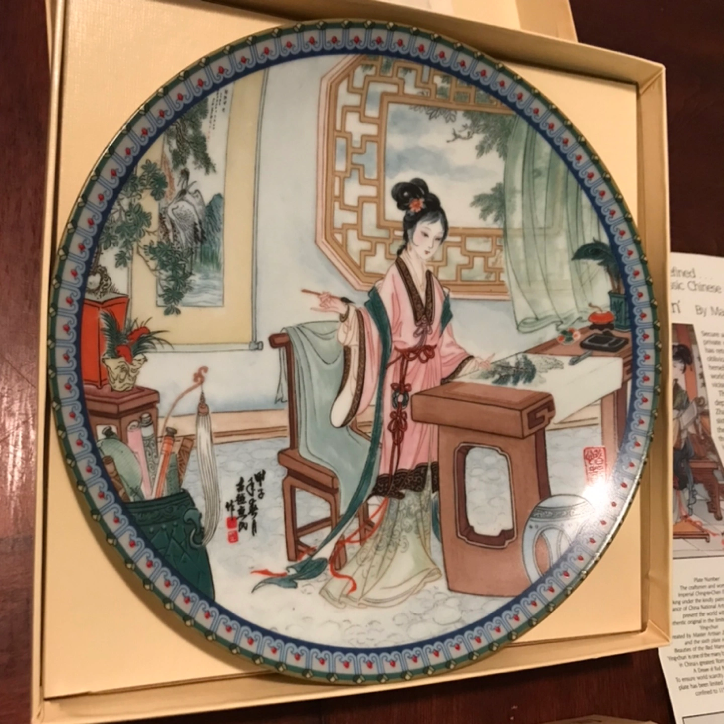 These exquisite porcelain plates are part of the “Ying Chun” (Welcoming Spring) series by renowned Chinese Master Artisan Zhao Huimin, celebrated for his delicate brushwork and classical themes. Artwork Features: • Elegant women • Ornate Ming-style furniture and garden view • Rich color palette with intricate border design • Chinese red seal and poetic inscriptions on front and back Backstamp Details: • “Qianlong Nian Zhi” (Made during the Qianlong reign)—a tribute to Qing Dynasty artistry • “Made in China” confirms modern reproduction • Decorative use only (not food safe) Included: • Original brochures featuring Zhao Huimin’s biography, artistic process, and full plate series • Plates are in mint condition, never displayed • Stored in original box in a smoke-free, climate-controlled environment Collector Value: • Documented provenance enhances appeal • Ideal for collectors of Jingdezhen-style porcelain or Chinese seasonal art • Perfect for display, gifting, or investment Cash only. No holds.