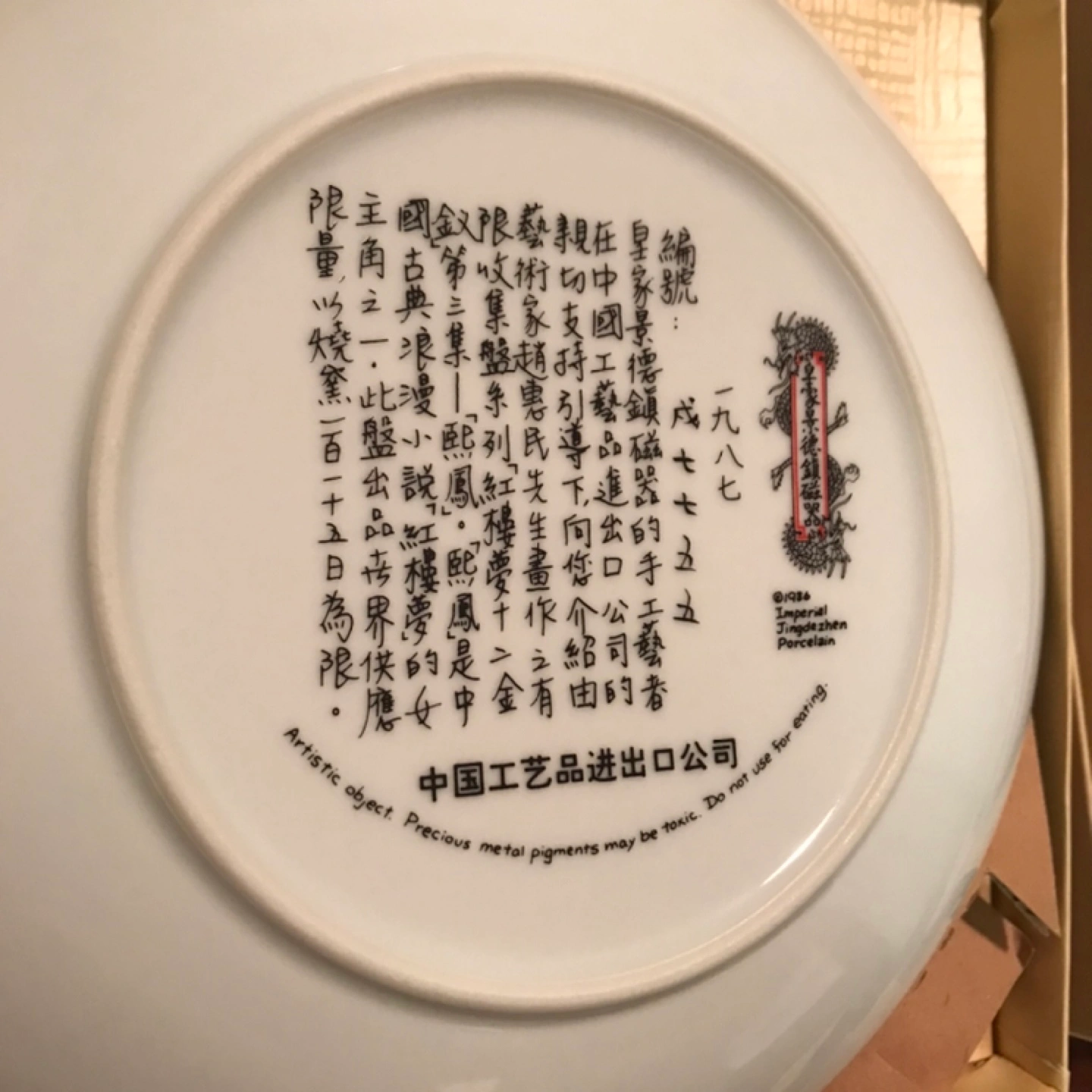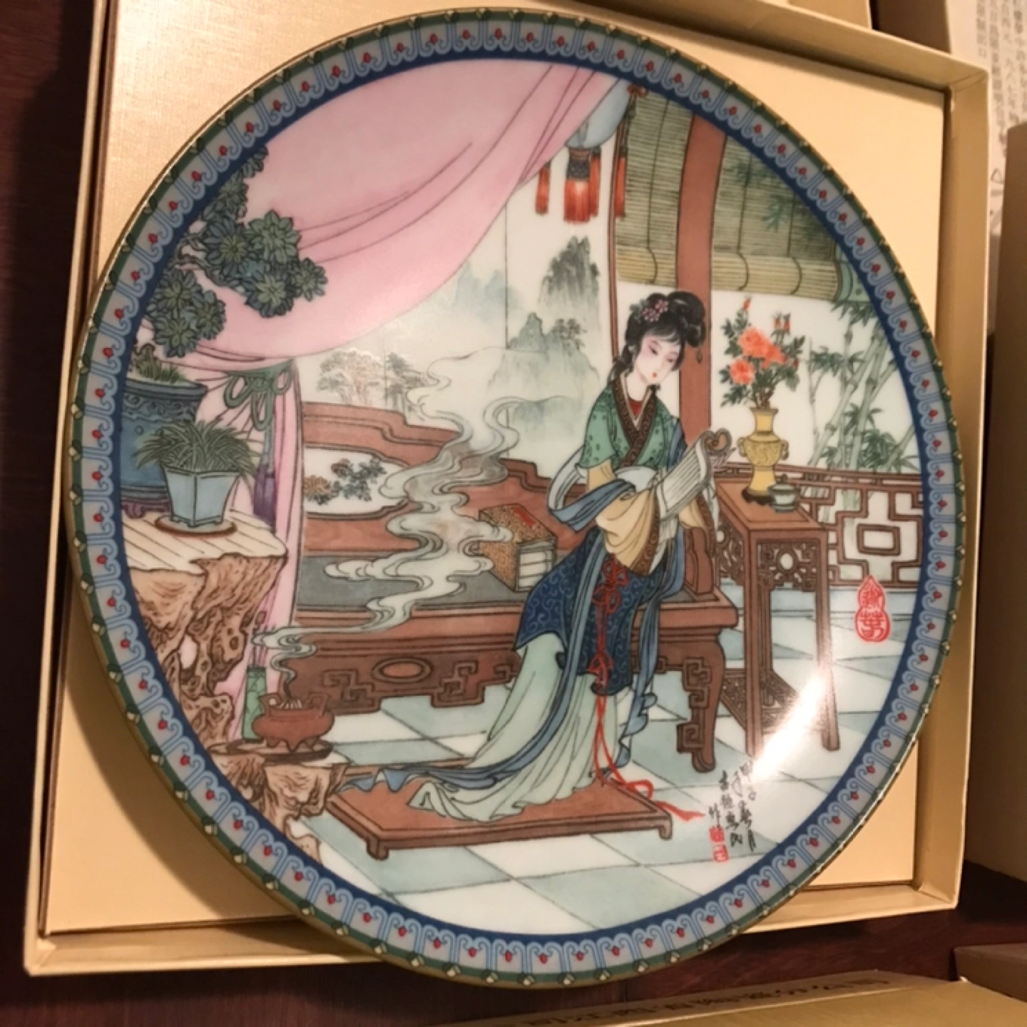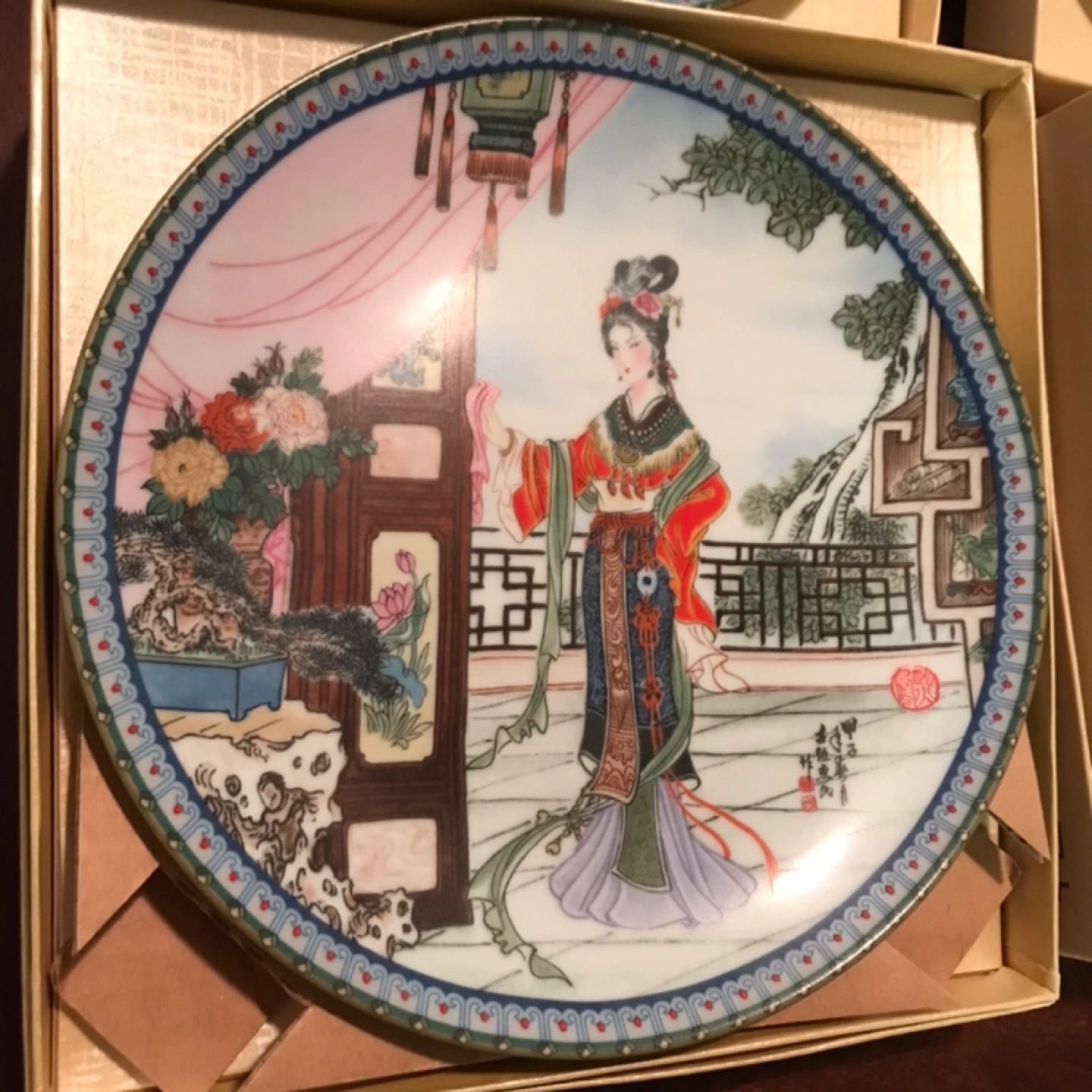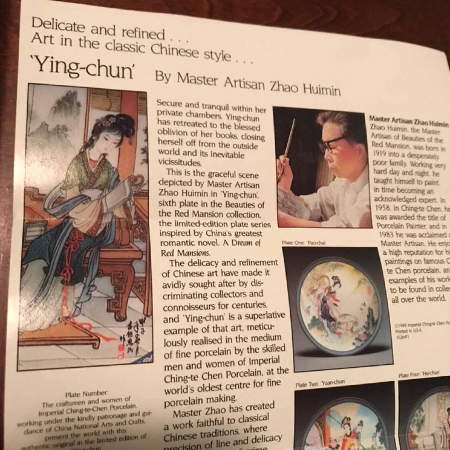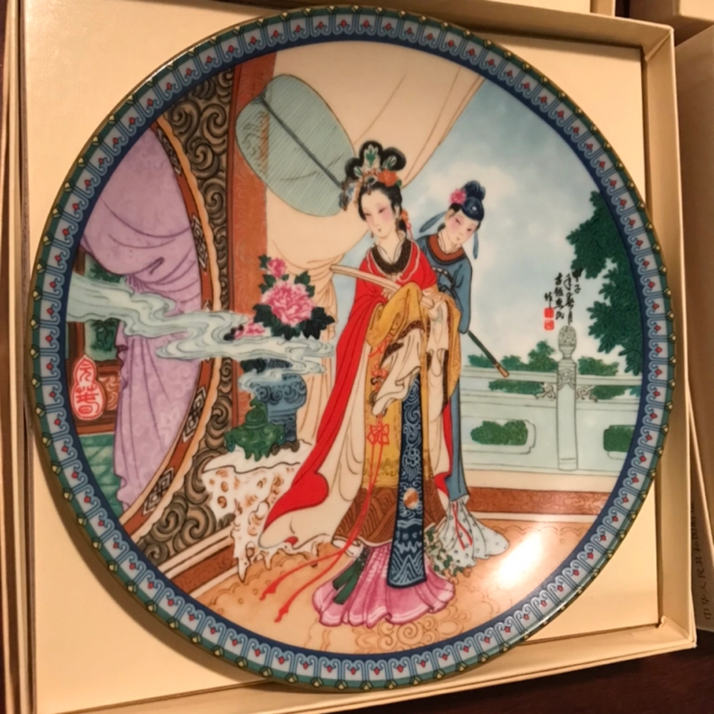 These exquisite porcelain plates are part of the “Ying Chun” (Welcoming Spring) series by renowned Chinese Master Artisan Zhao Huimin, celebrated for his delicate brushwork and classical themes. Artwork Features: • Elegant women • Ornate Ming-style furniture and garden view • Rich color palette with intricate border design • Chinese red seal and poetic inscriptions on front and back Backstamp Details: • “Qianlong Nian Zhi” (Made during the Qianlong reign)—a tribute to Qing Dynasty artistry • “Made in China” confirms modern reproduction • Decorative use only (not food safe) Included: • Original brochures featuring Zhao Huimin’s biography, artistic process, and full plate series • Plates are in mint condition, never displayed • Stored in original box in a smoke-free, climate-controlled environment Collector Value: • Documented provenance enhances appeal • Ideal for collectors of Jingdezhen-style porcelain or Chinese seasonal art • Perfect for display, gifting, or investment Cash only. No holds.