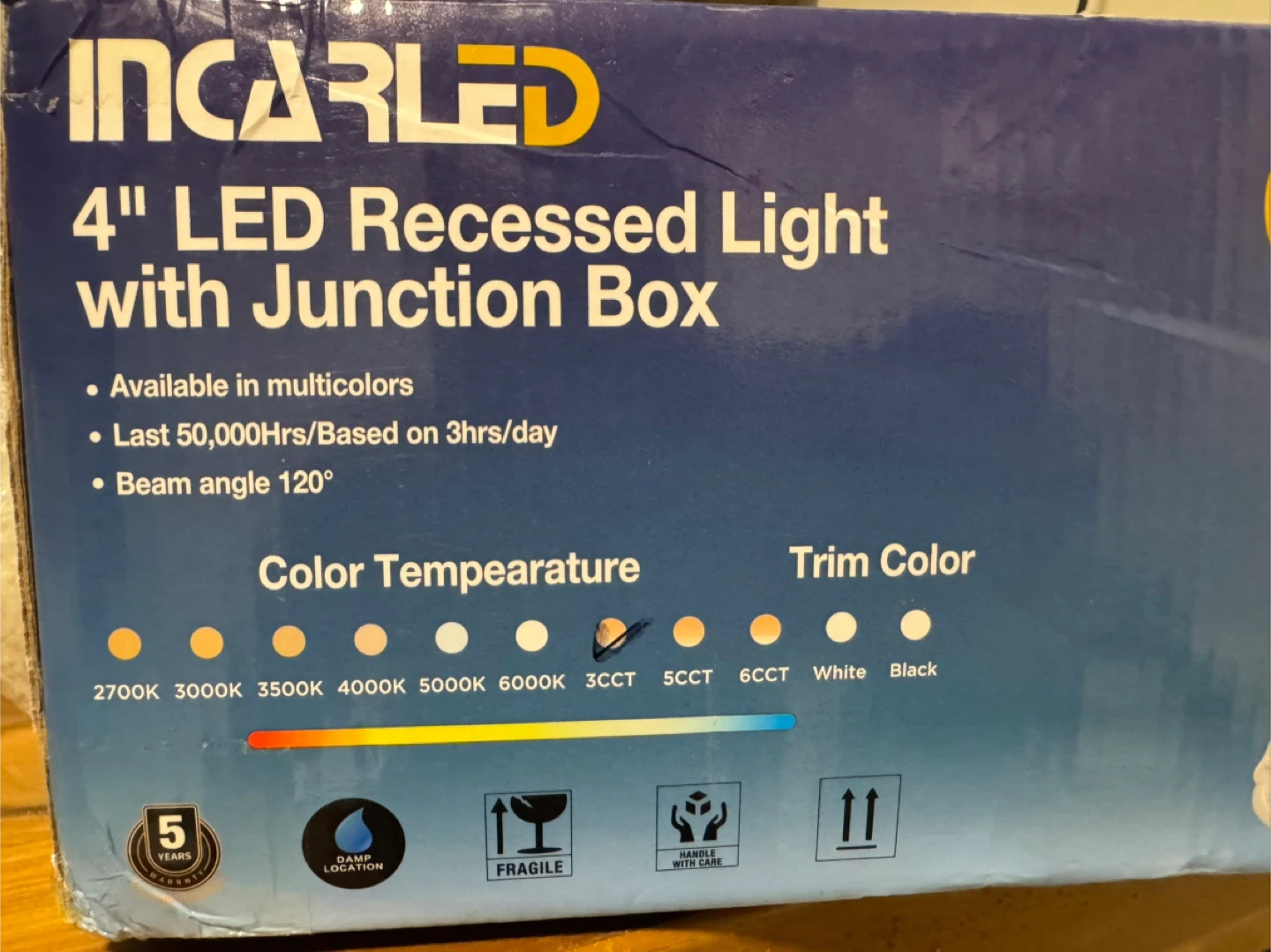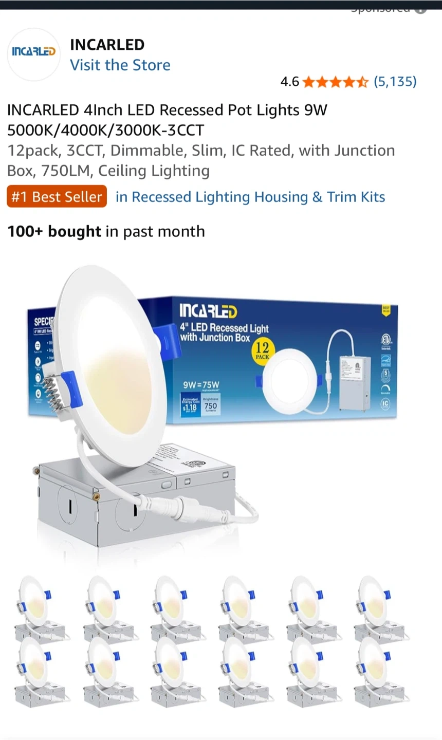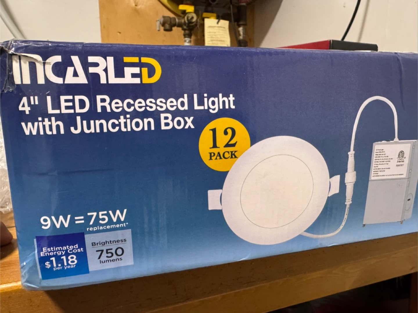 Selling a brand new set of INCARLED 4-inch LED recessed pot lights! This is a 12-pack set, complete with junction boxes. They are 9W, equivalent to 75W, and provide 750 lumens of ceiling lighting. The lights are dimmable, slim, and IC rated. They have a 3CCT colour temperature. The box also indicates an estimated yearly energy cost of $1.18 per bulb, based on 3 hours of use per day $60, firm price
