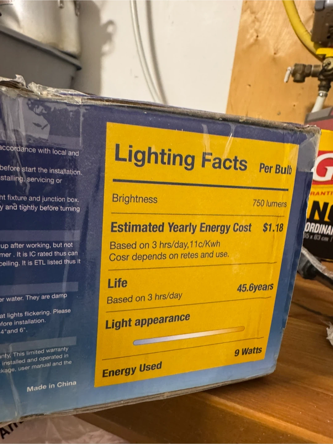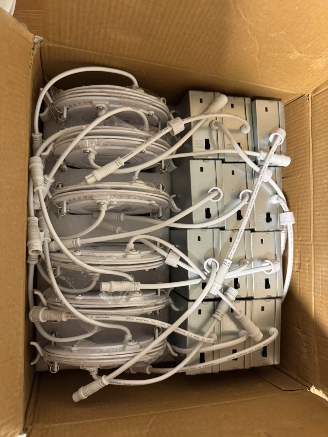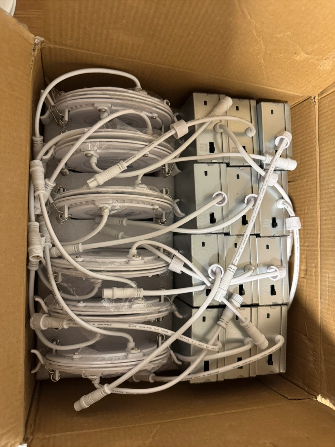 Selling a brand new set of INCARLED 4-inch LED recessed pot lights! This is a 12-pack set, complete with junction boxes. They are 9W, equivalent to 75W, and provide 750 lumens of ceiling lighting. The lights are dimmable, slim, and IC rated. They have a 3CCT colour temperature. The box also indicates an estimated yearly energy cost of $1.18 per bulb, based on 3 hours of use per day $60, firm price
